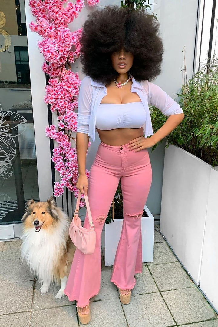Available In Black, Blush, Olive And White. | Flare Jean | High Stretch | Ripped Knee | Functional Back Pockets | Frayed Hem | 34" Inseam | 11" High Rise | Disclaimer: Plus Only - Runs Small, Shop One Size Up. Due To The Specialized Wash & Distressing Process, Each Garment Is Unique. | 52% Tencel, 36% Cotton, 10% Elasterell, 2% Spandex | Imported