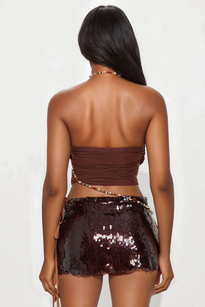 Available In Brown. | Halter Top | Stretch | Beaded Chain Strap | Cowl Neck | Ruched | Cut Out | Beaded Embellishment | Cropped | Self: 95% Nylon 5% Spandex | Lining: 95% Nylon 5% Spandex | Imported