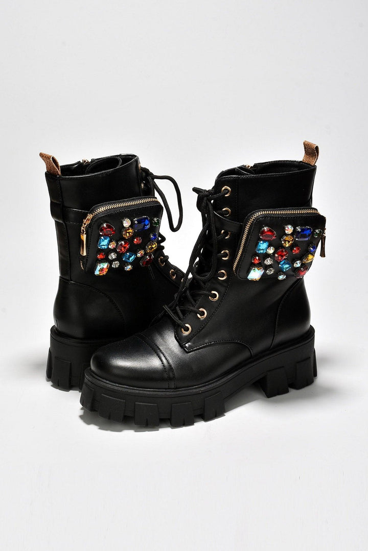 NEMOYA - BLACK - BOOTIES by CAPE ROBBIN closed round toe pouch detail zipper closure pull tab lace up vamp rubber outsole memory foam footbed It's time to make an entrance! The chic Nemoya features a chunky lug sole for all-terrain fun. Plus,the rhinestone and gem trim adds a splash of sparkle.