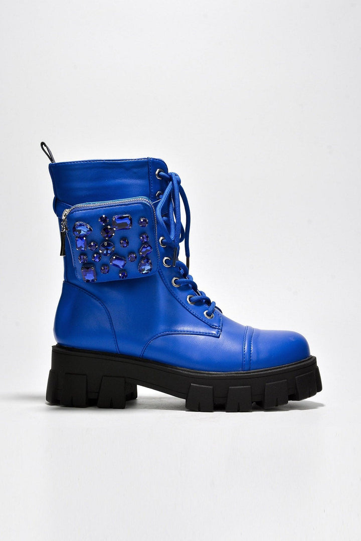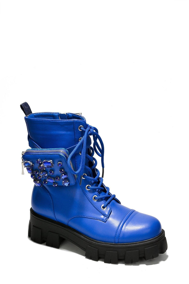 NEMOYA - BLUE - BOOTIES by CAPE ROBBIN closed round toe pouch detail zipper closure pull tab lace up vamp rubber outsole memory foam footbed It's time to make an entrance! The chic Nemoya features a chunky lug sole for all-terrain fun. Plus,the rhinestone and gem trim adds a splash of sparkle.