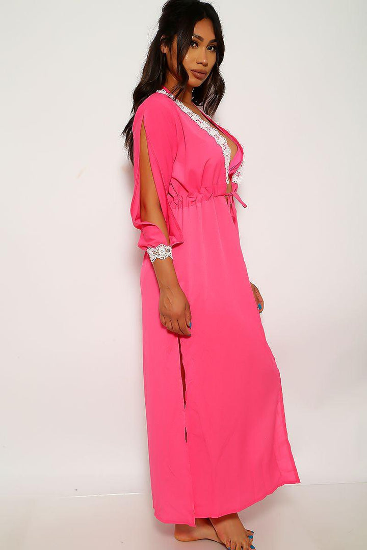 Have some fun in the sun in this sexy swimsuit! Featuring; triangle top, low rise bottoms, tie knot straps, sleeve slit detail, crochet detail, and a kimono cover up included. 90% polyester 10% spandex.