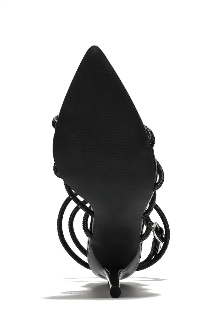NETTLE - BLACK - HEELS by CAPE ROBBIN Heel height: 4.5-inch. Ankle strap with buckle PU leather insole with memory foam Rhinestone coated straps Pointed toe The Nettle heel features multiple rhinestone-coated straps that wrap around your foot, offering a chic and glamorous look. Designed for the modern woman who loves to make a statement, these sleek and elegant sandals are perfect for adding a touch of glamour to any outfit. Elevate your wardrobe with the Nettle Rhinestone Strappy Stiletto Heels. Whether you're heading to a special event, a night out, or a chic brunch, these heels will ensure you step out in style and confidence.