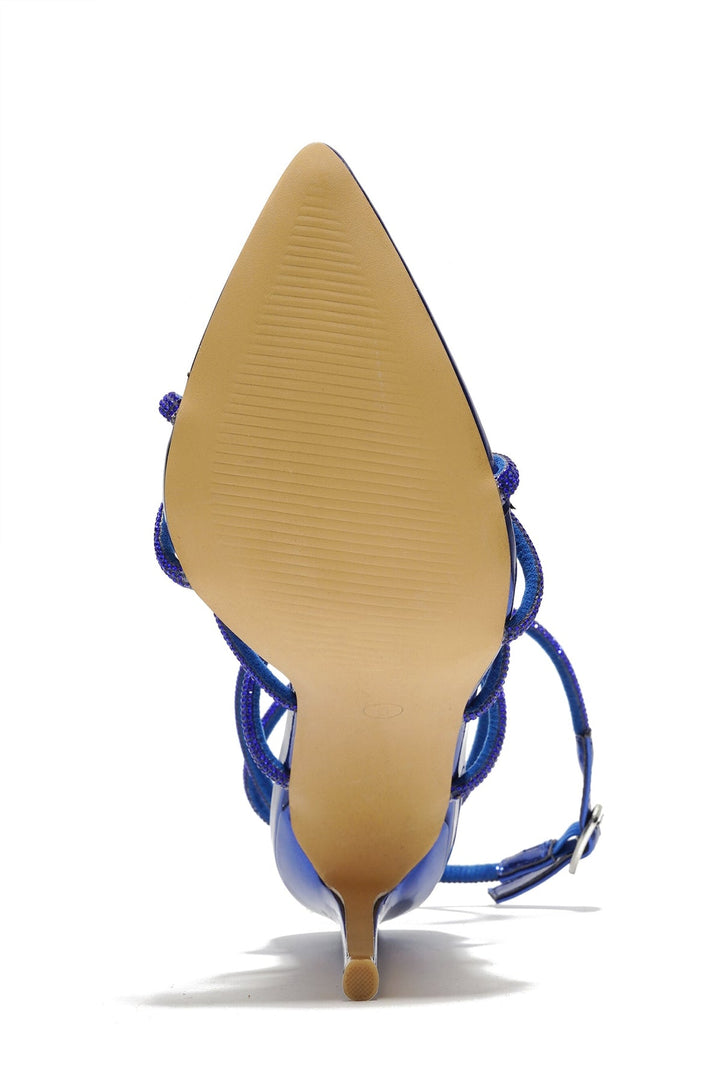 NETTLE - BLUE - HEELS by CAPE ROBBIN Heel height: 4.5-inch. Ankle strap with buckle PU leather insole with memory foam Rhinestone coated straps Pointed toe The Nettle heel features multiple rhinestone-coated straps that wrap around your foot, offering a chic and glamorous look. Designed for the modern woman who loves to make a statement, these sleek and elegant sandals are perfect for adding a touch of glamour to any outfit. Elevate your wardrobe with the Nettle Rhinestone Strappy Stiletto Heels. Whether you're heading to a special event, a night out, or a chic brunch, these heels will ensure you step out in style and confidence.