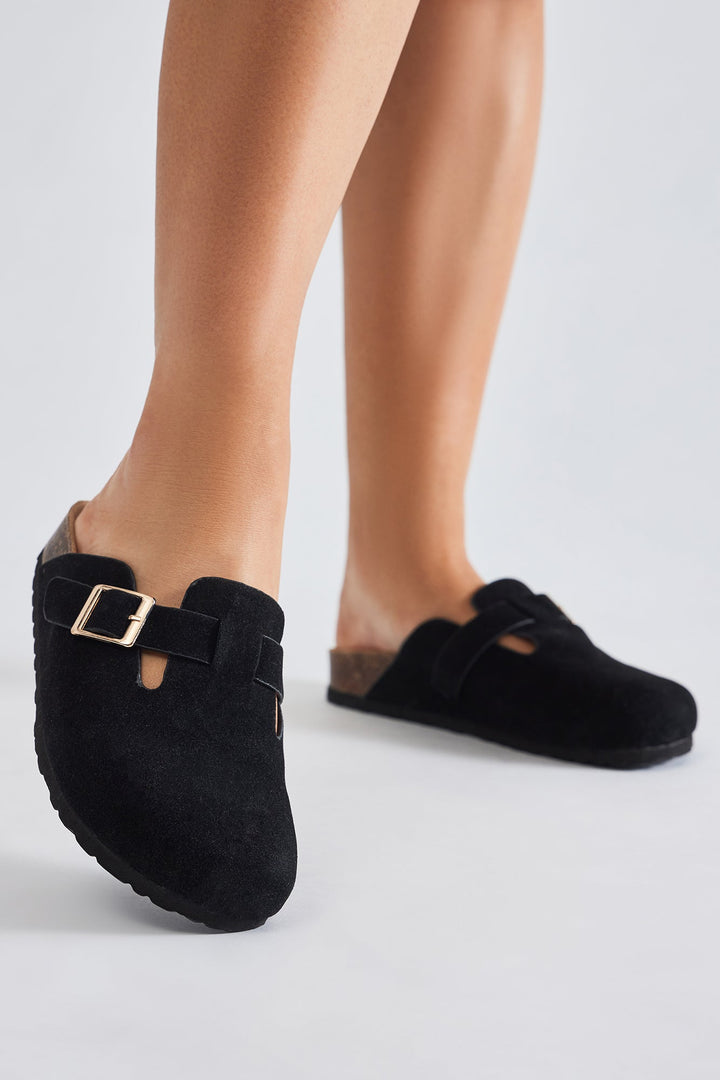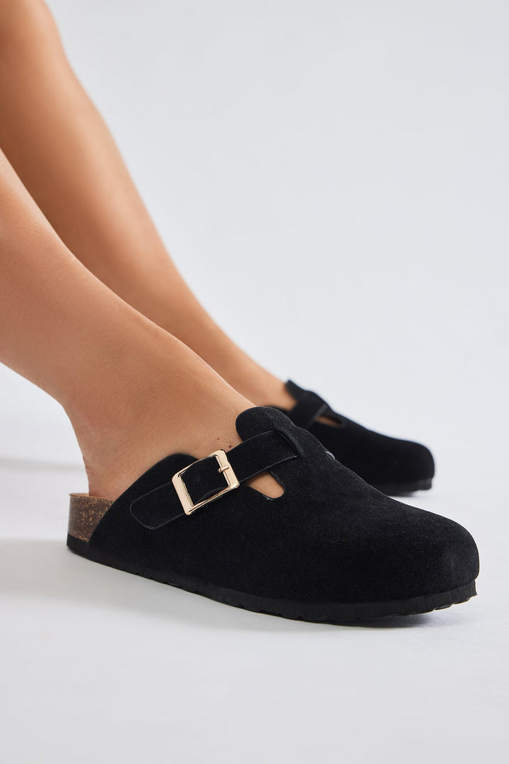 Available In Black. | Casual Slides | Buckle Detail | Round Toe | Flat Heel | Imported