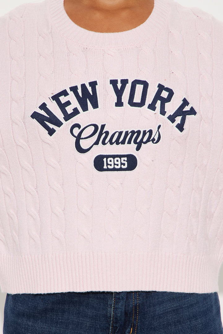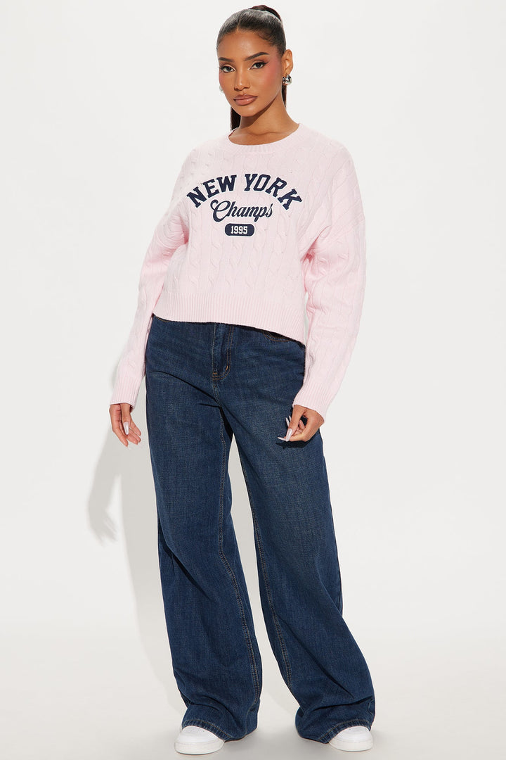 Available In Pink. | Cable Knit Sweater | "New York" Graphic | 50% Rayon , 30% Polyester , 20% Nylon | Imported