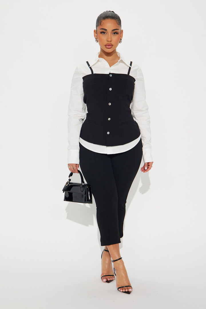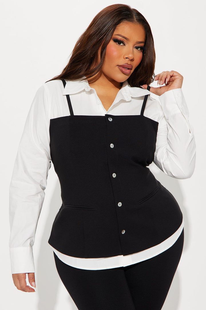 Available In White/Black. | Poplin Shirt | Non Stretch | Attached Vest | Self: 100% Cotton | Contrast: 92% Polyester 8% Spandex | Imported