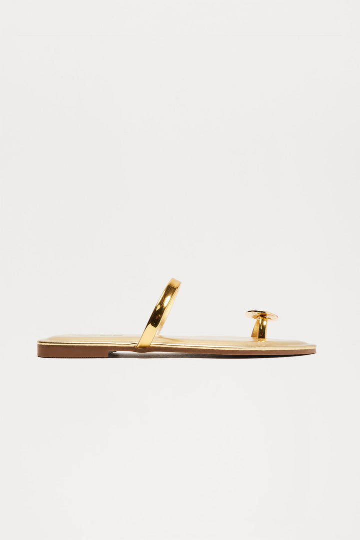 Available In Black And Gold. | Flat Sandals | Toe Hardware Detail | Round Toe | Flat Heel | Imported