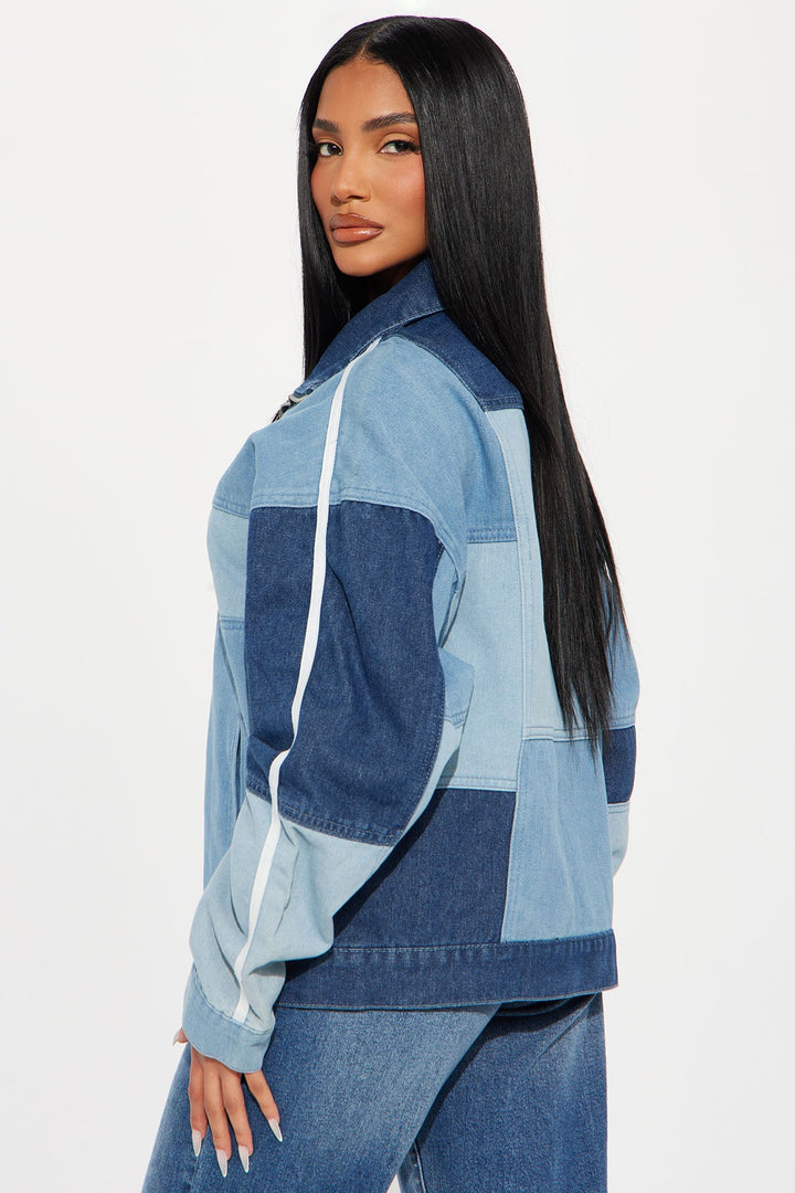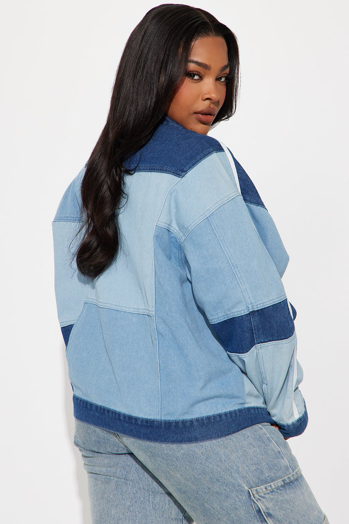 Available In Light Wash. | Denim Jacket | Collar | Long Sleeve | Denim | Reconstructed | Patchwork | Stripe Detail | Full Zip | Pockets | Non Lined | "Disclaimer: Due To The Specialized Wash Process, Each Garment Is Unique. | Shell 85% Cotton 15% Polyester | Imported