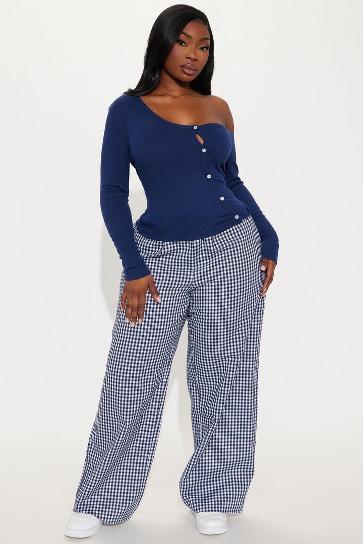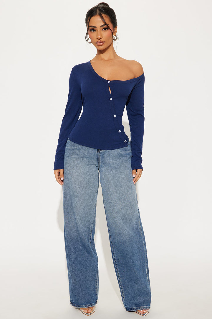 Available In Navy And Yellow. | Off Shoulder Top | Stretch | Button Up | Ribbed | 70% Polyester 27% Rayon 3% Spandex | Imported