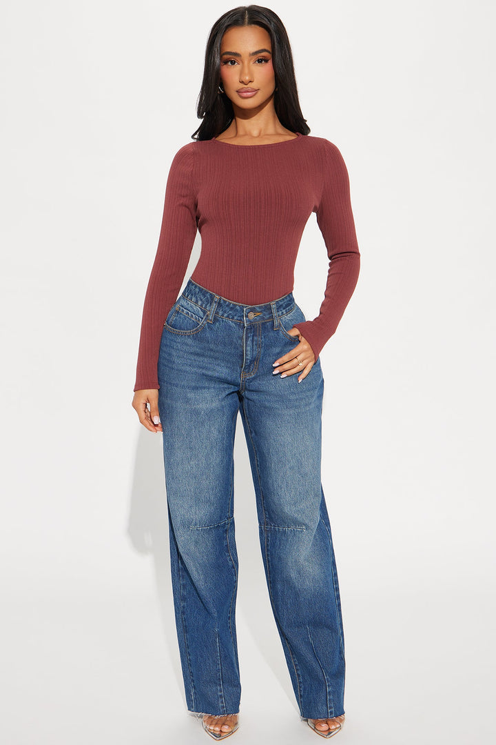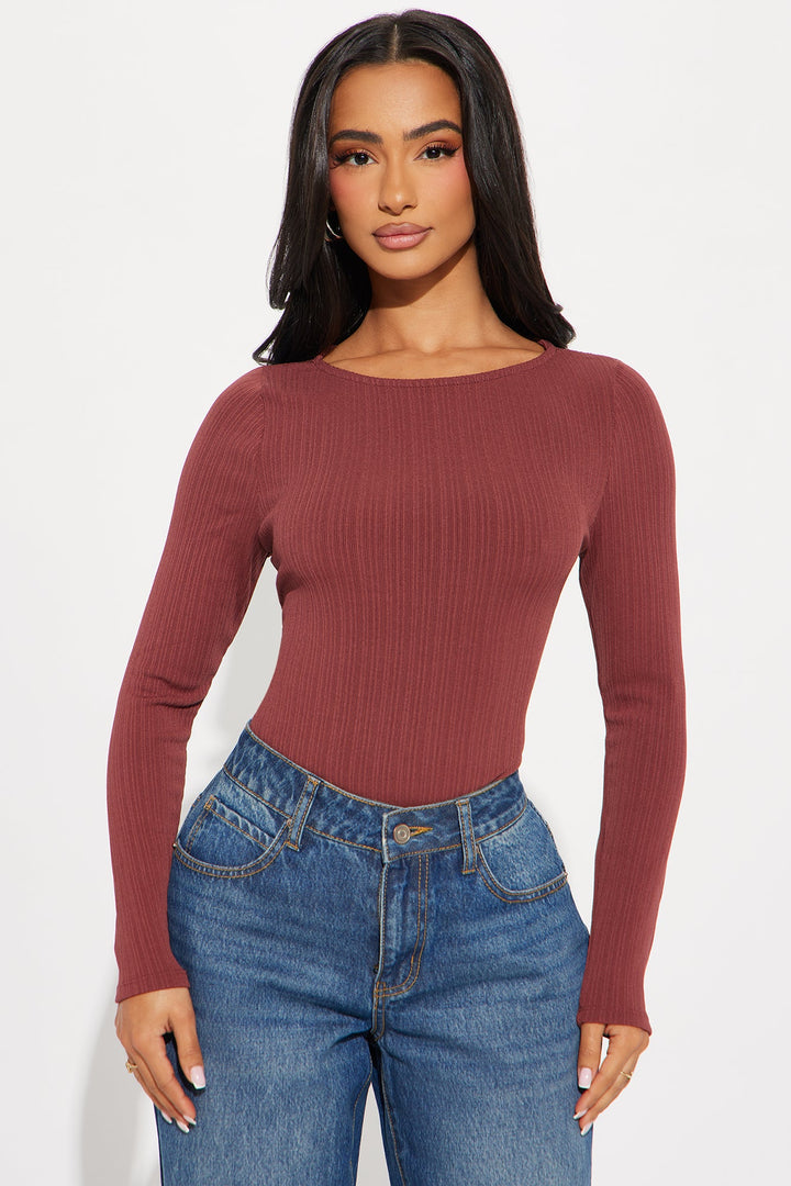 Available In Coco. | Ribbed Bodysuit | Stretch | Long Sleeve | Thong Bottom | Snap Closure | 95% Polyester 5% Spandex | Imported