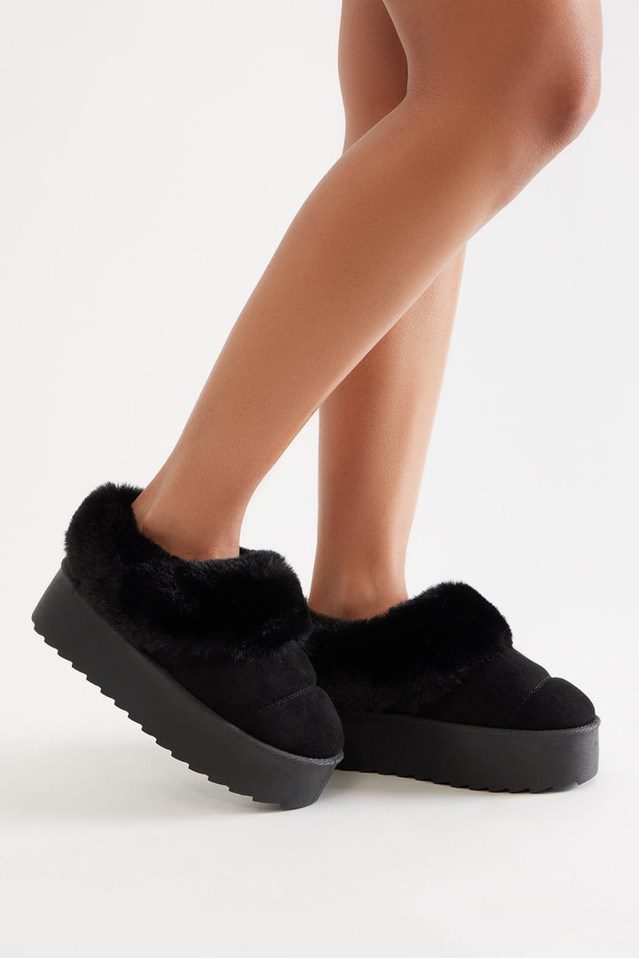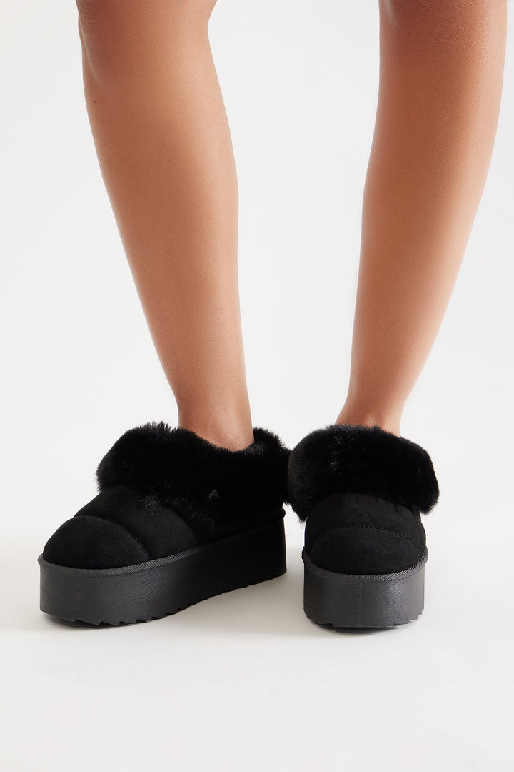 Available In Black And Tan. | Booties | Fur Trim | Round Toe | 1" Low Platform Heel | Imported