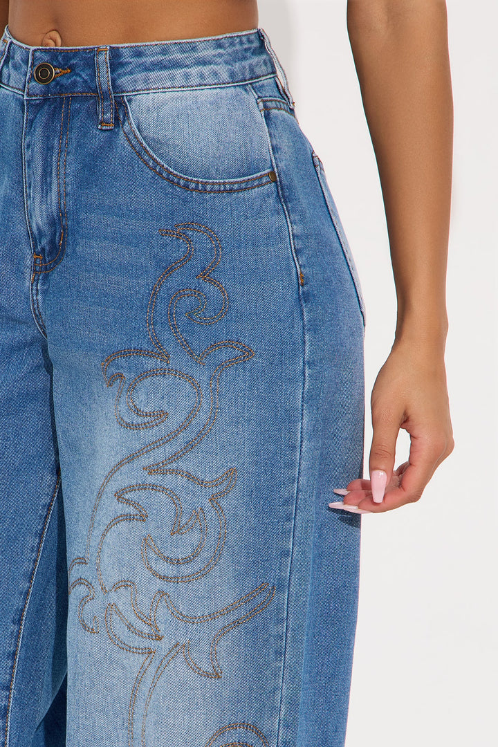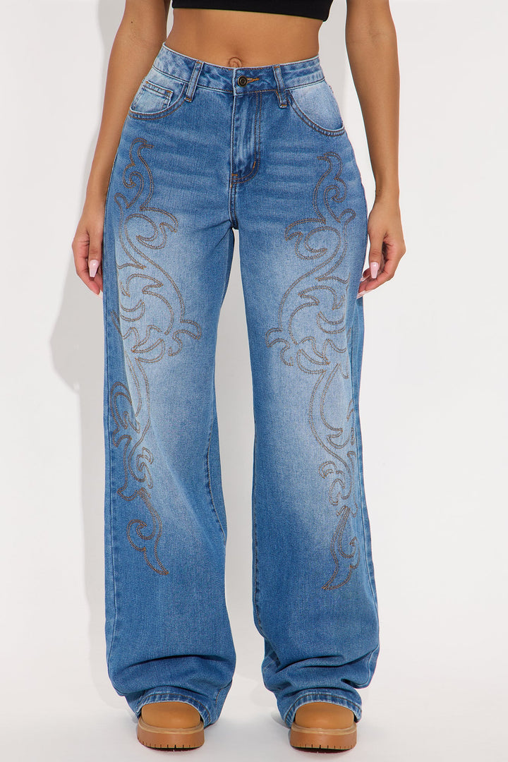 Available In Medium Wash. | Wide Leg Jeans | 5 Pocket | Embroidered | 10.5" Rise | 33" Inseam | Non Stretch | Disclaimer Due To The Specialized Wash Process, Each Garment Is Unique. | 81% Cotton 11% Polyester 8% Viscose | Imported