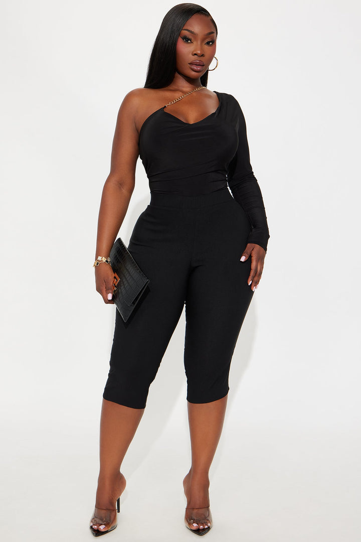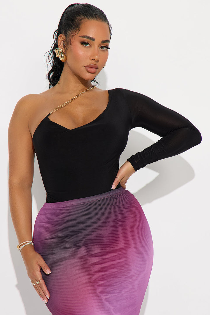 Available In Black And Burgundy. | Bodysuit | Final Sale | One Shoulder | Long Sleeve | Chain Strap | Adjustable | Draped Detail | Cheeky Bottom | Snap Closure | Stretch | Self : 95% Polyester 5% Spandex | Imported
