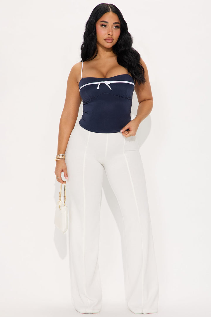 Available In Navy/combo And White/Black. | Cami Top | Stretch | Bow Detail | Ruched Bust | Seaming | Contrast Trim | Cropped | Self: 92% Polyester 8% Spandex | Lining: 100% Polyester | Imported