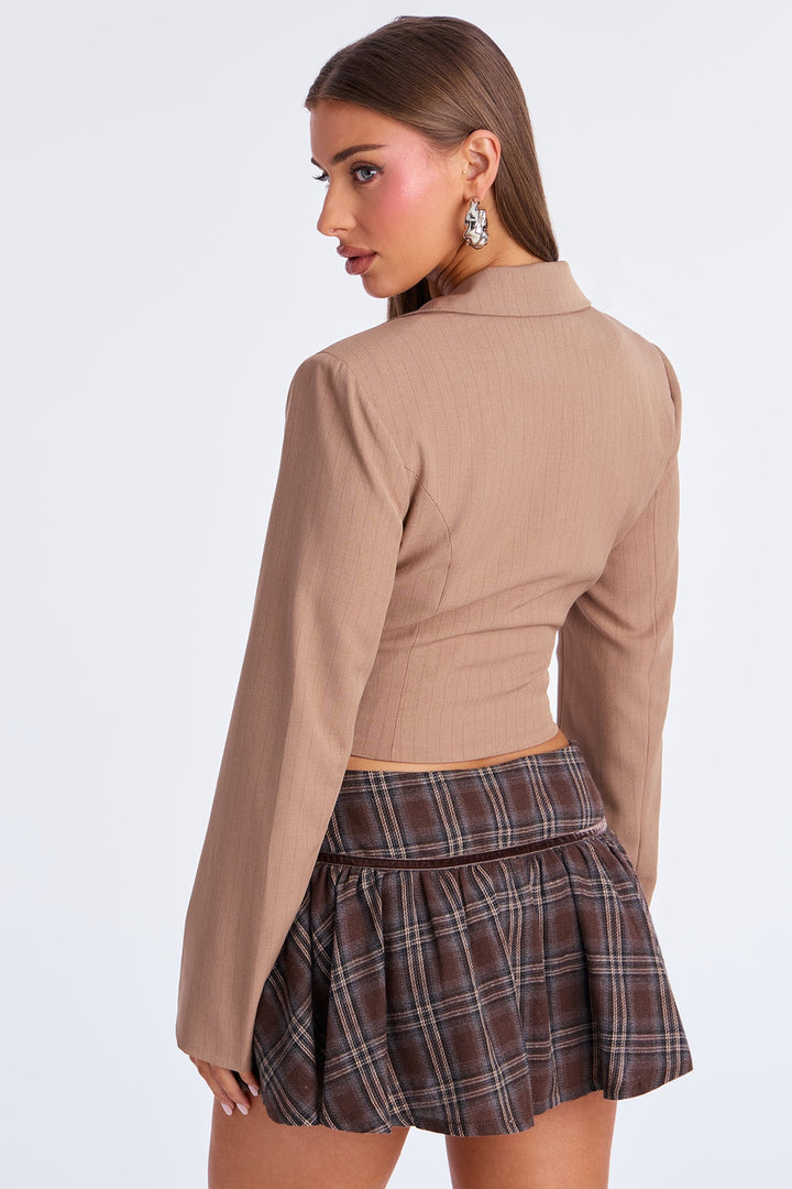 Available In Charcoal And Mocha. | Corset Top | V Neck | Long Sleeve | Crepe Woven | Lace Up Detail | Pinstripe | Non Stretch | Self: 94% Polyester 5% Spandex 1% Rayon | Lining: 100% Polyester | Imported