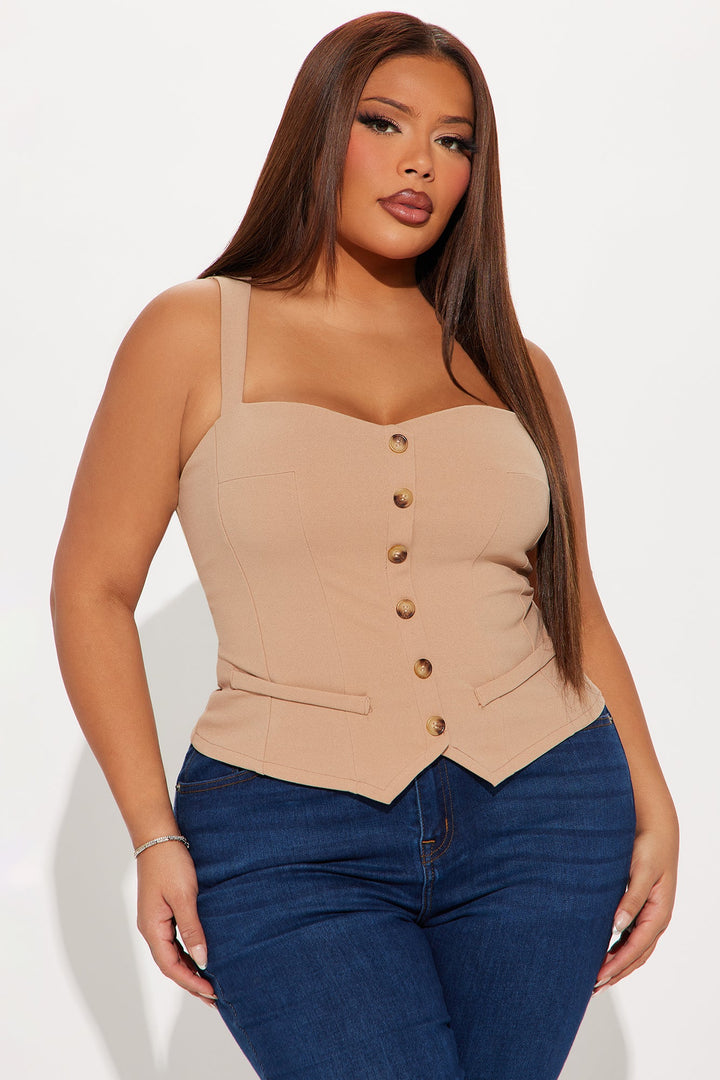Available In Nude. | Vest Top | Sweetheart Neckline | Faux Buttons | Back Zipper Detail | Stretch | Self: 95% Polyester 5% Spandex | Lining: 100% Polyester | Imported