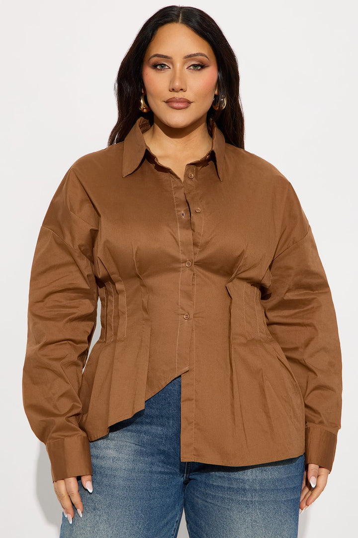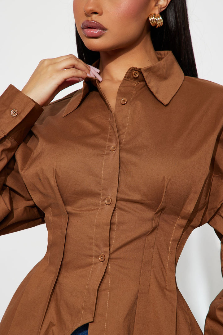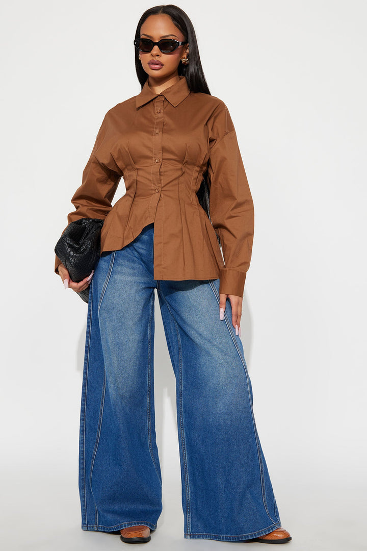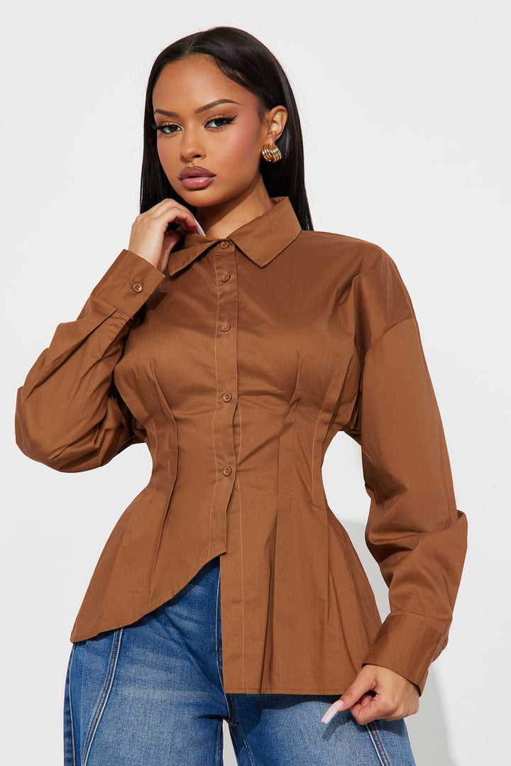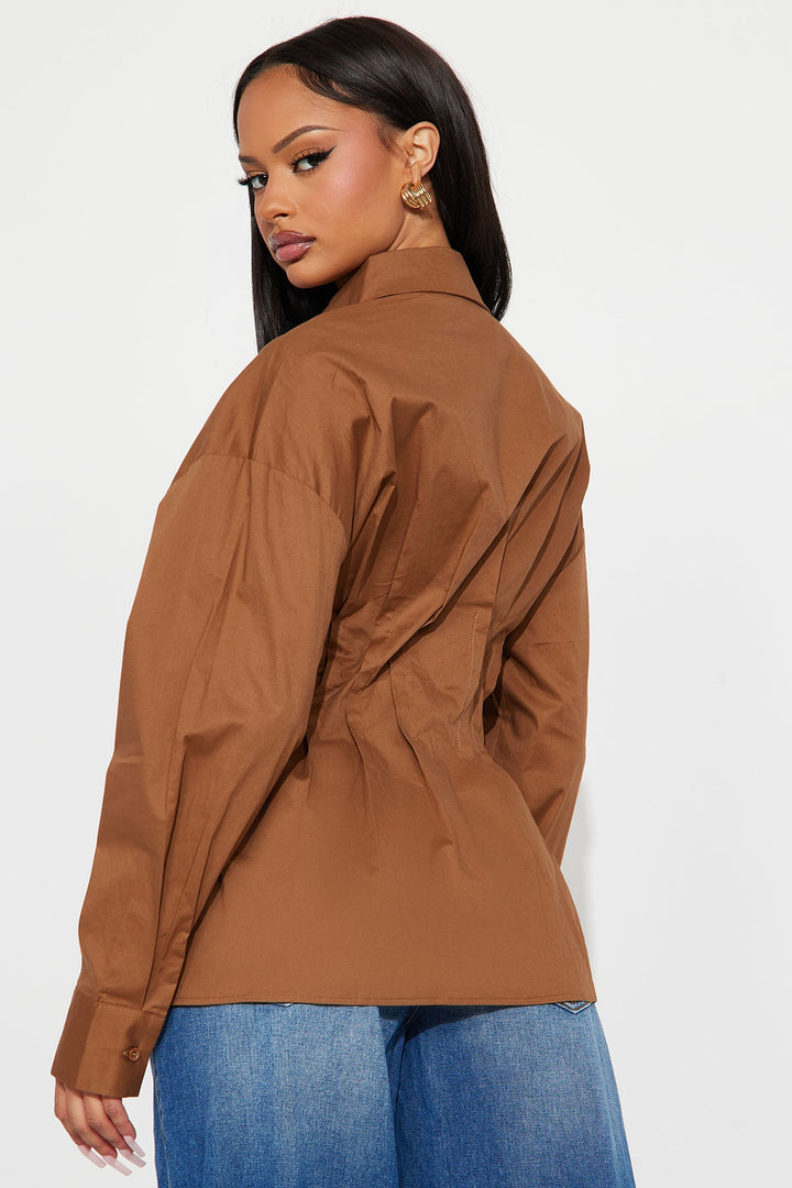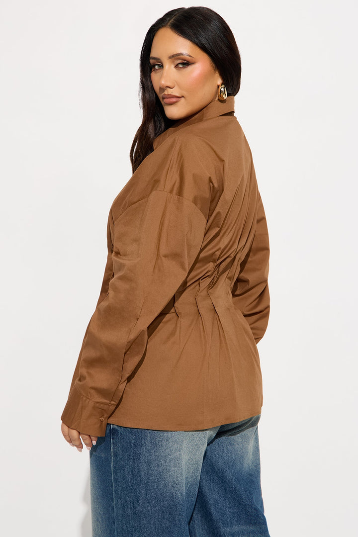 Available In Khaki And White. | Poplin Shirt | Collared | Long Sleeve | Button Up | Pleated Detail | Cuff Button | Shell: 97% Cotton 3% Spandex | Imported