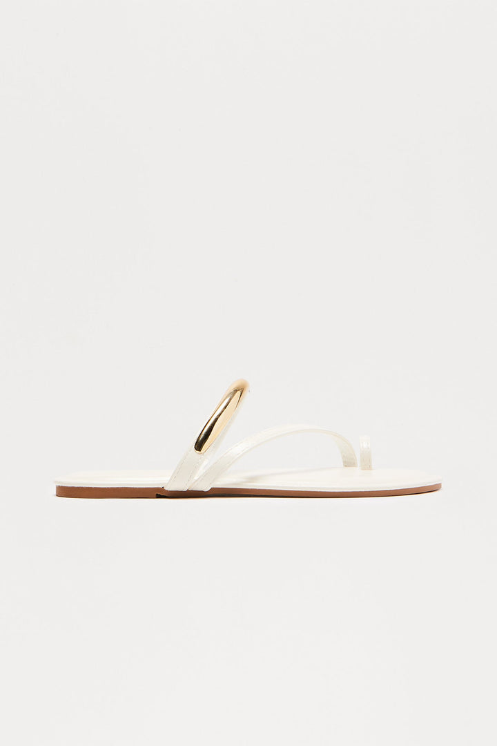 Available In Black, Gold And Ivory. | Flat Sandals | Hardware Detail | Toe Ring Detail | Round Toe | Flat Heel | Imported