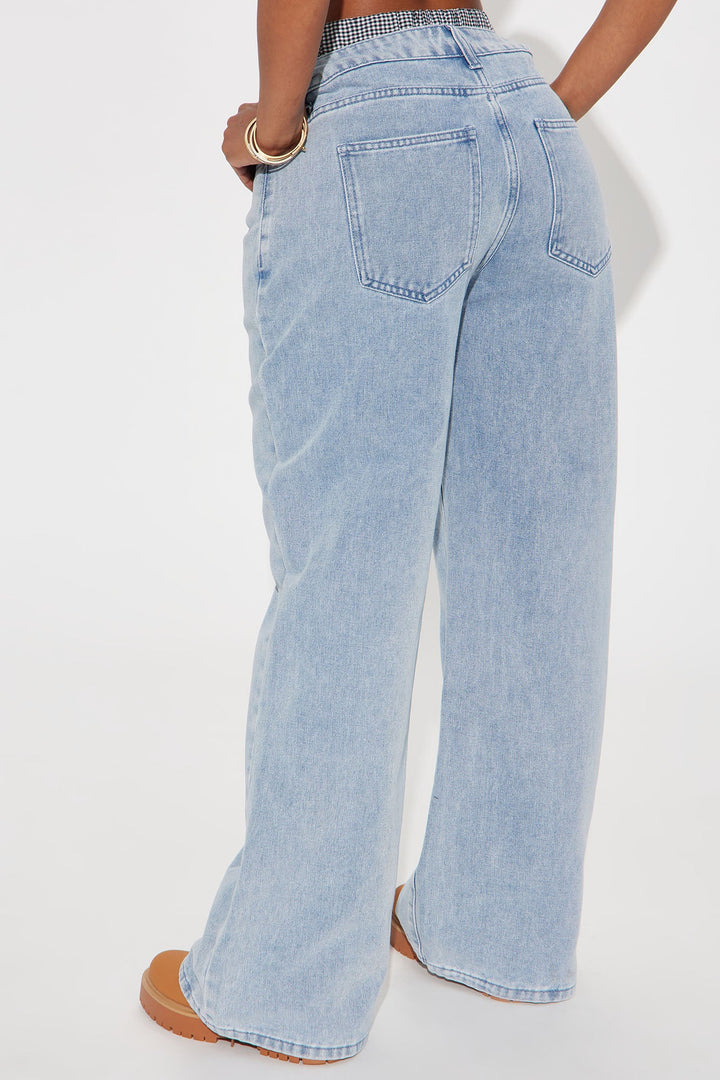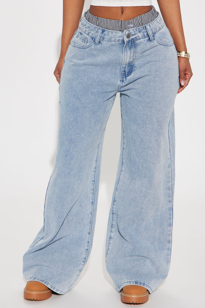 Available In Light Wash And Medium Wash. | Wide Leg Jean | 5 Pocket | Boxer Trim Waistband | Baggy Fit | 11" High Rise | 31" Inseam | Low Stretch | Disclaimer: Due To The Specialized Wash, Each Garment Is Unique. | 85% Cotton 15% Polyester | Imported