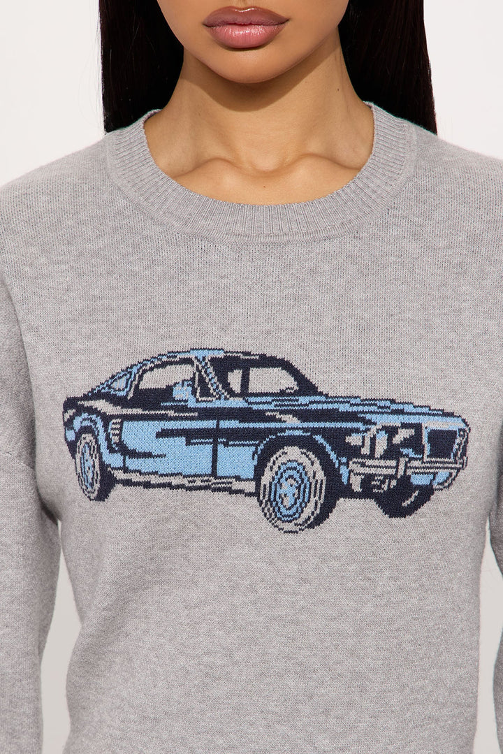 Available In Heather Grey. | Pullover Sweater | Car Graphic | Disclaimer: Due To The Printing Process A Difference In Saturation May Occur. Each Garment Is Unique. | 50% Rayon 28% Polyester 22% Nylon | Imported