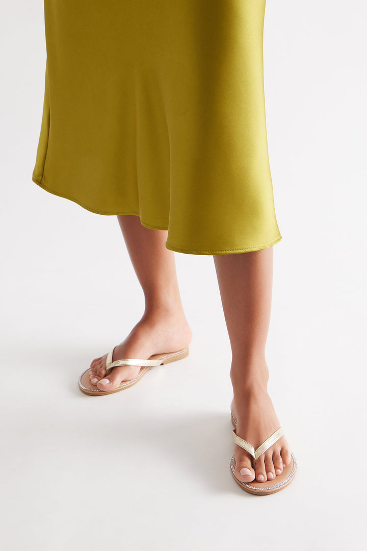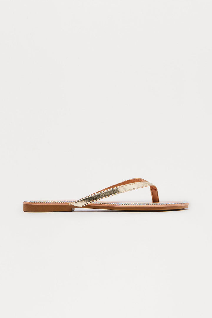 Available In Gold And Silver. | Flat Sandals | Flip Flops | Rhinestone Trim | Round Toe | Flat Heel | Imported