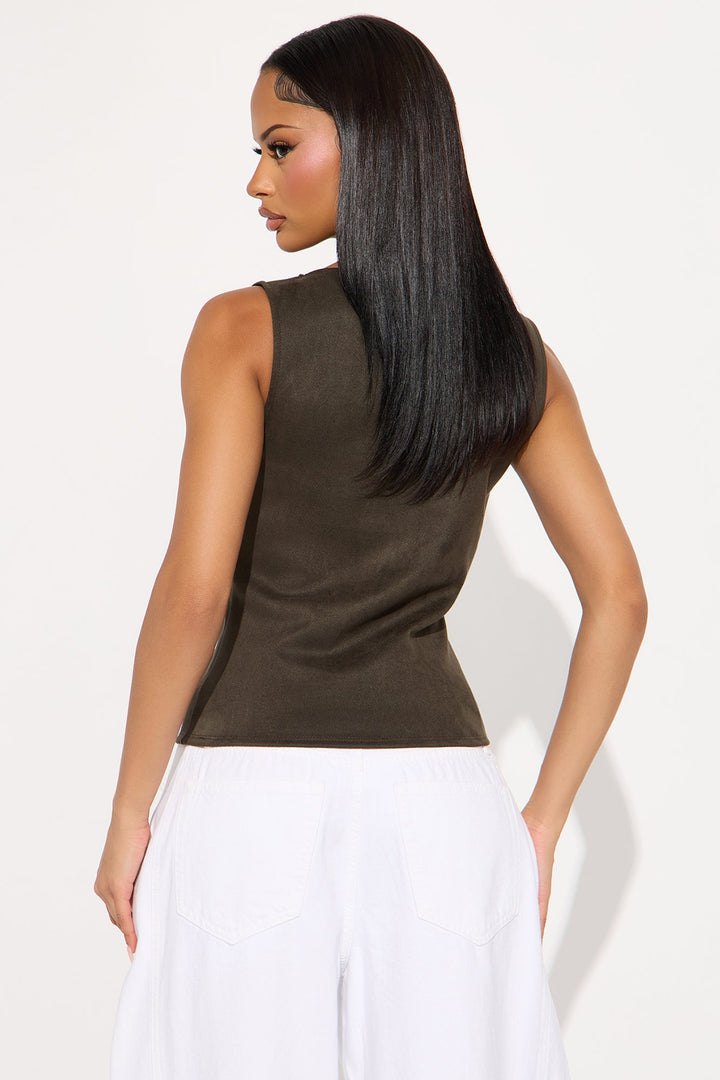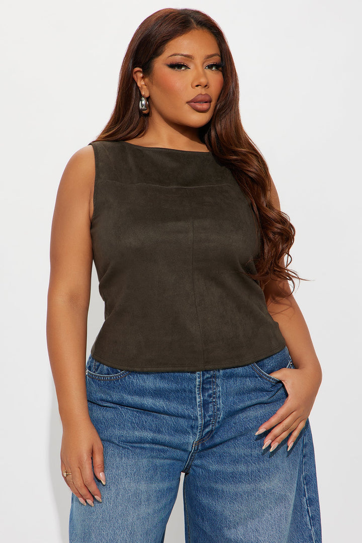 Available In Camel And Grey. | Faux Suede Top | High Neck | Sleeveless | Stretch | Self: 95% Polyester 5% Spandex | Imported