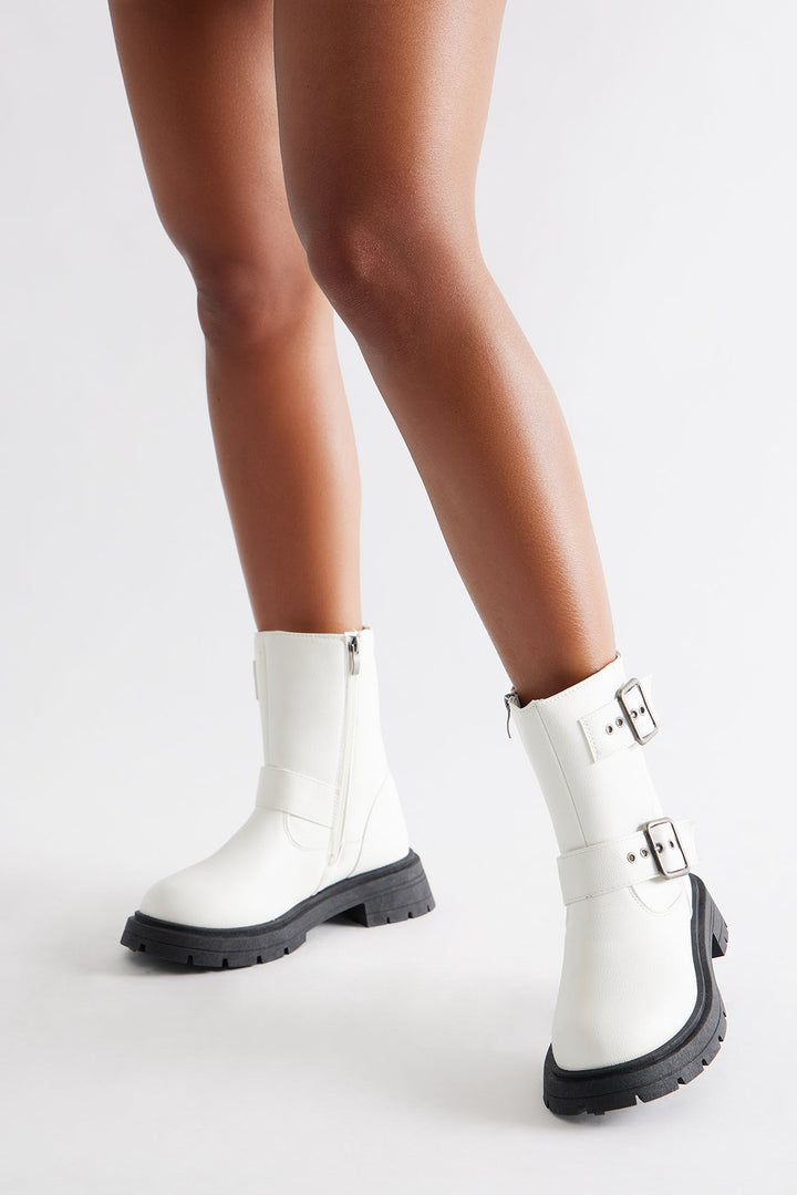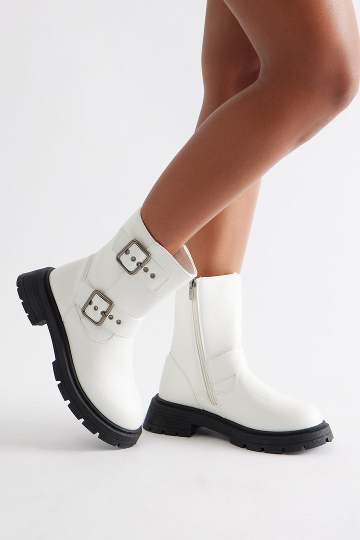 Available In Black, Brown And White. | Flat Boots | Buckle Detail | Round Toe | Flat Heel | Imported