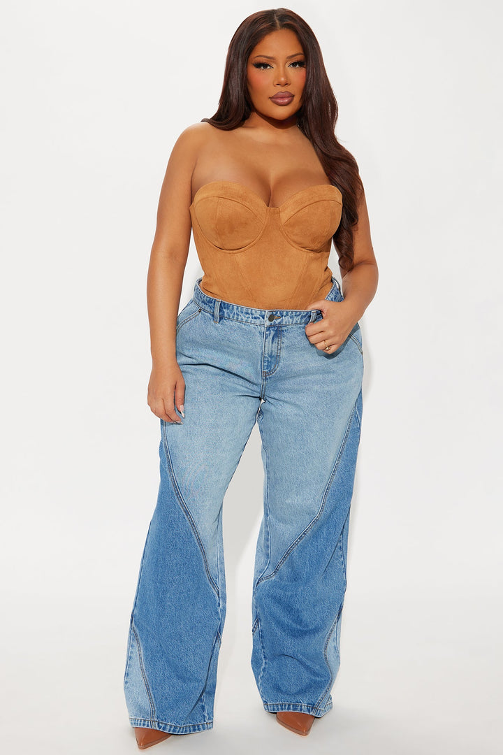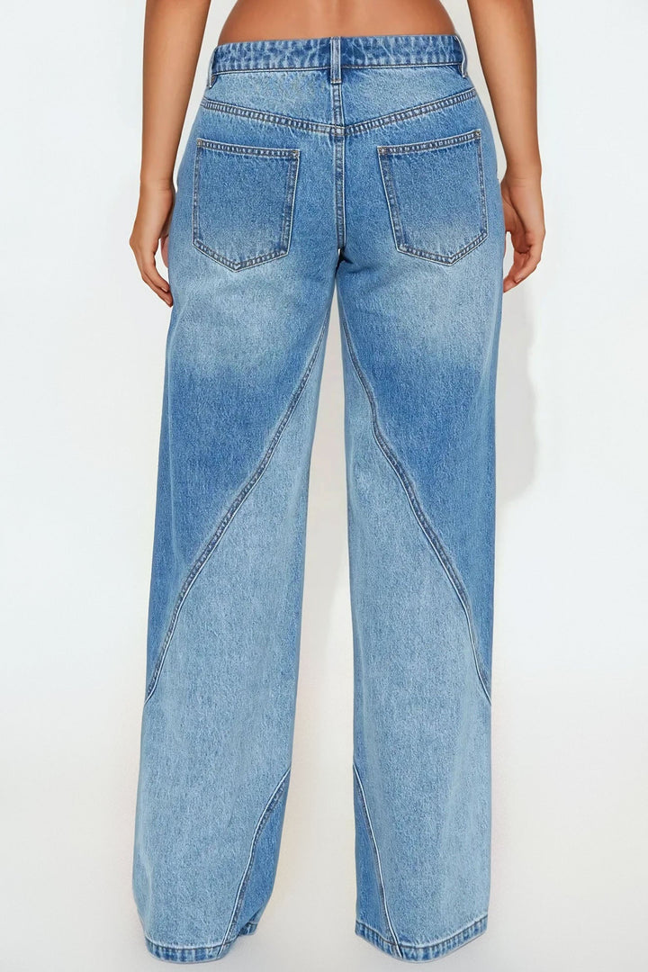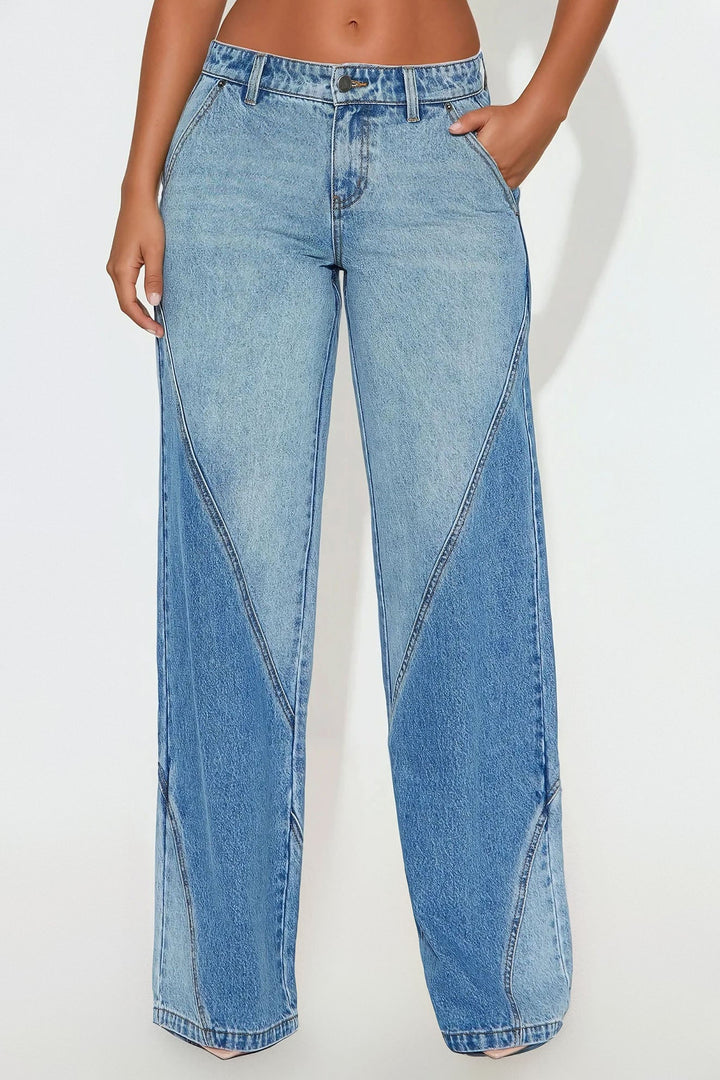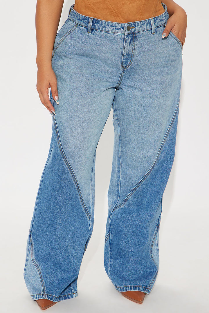 Available In Light Blue Wash. | Wide Leg Jean | 4 Pocket | Seaming | Two Tone | Non-Stretch | 10" Mid Rise | 34" Inseam | 100% Cotton | Imported