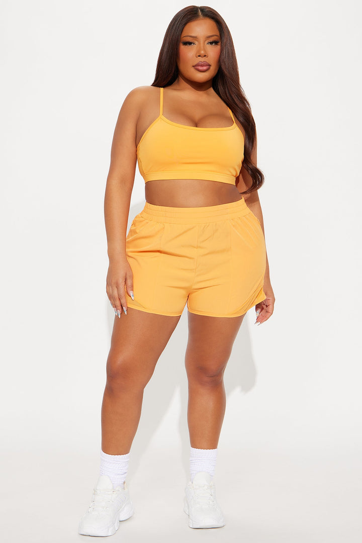 Available In Slate Blue And Tangerine. | Sports Bra | Scoop Neck | Sleeveless | Elevate | High Impact | Stretch | Pair With "Outer Glow Active Running Short" | Self: 73% Polyester 27% Spandex | Mesh: 82% Nylon 18% Spandex | Imported