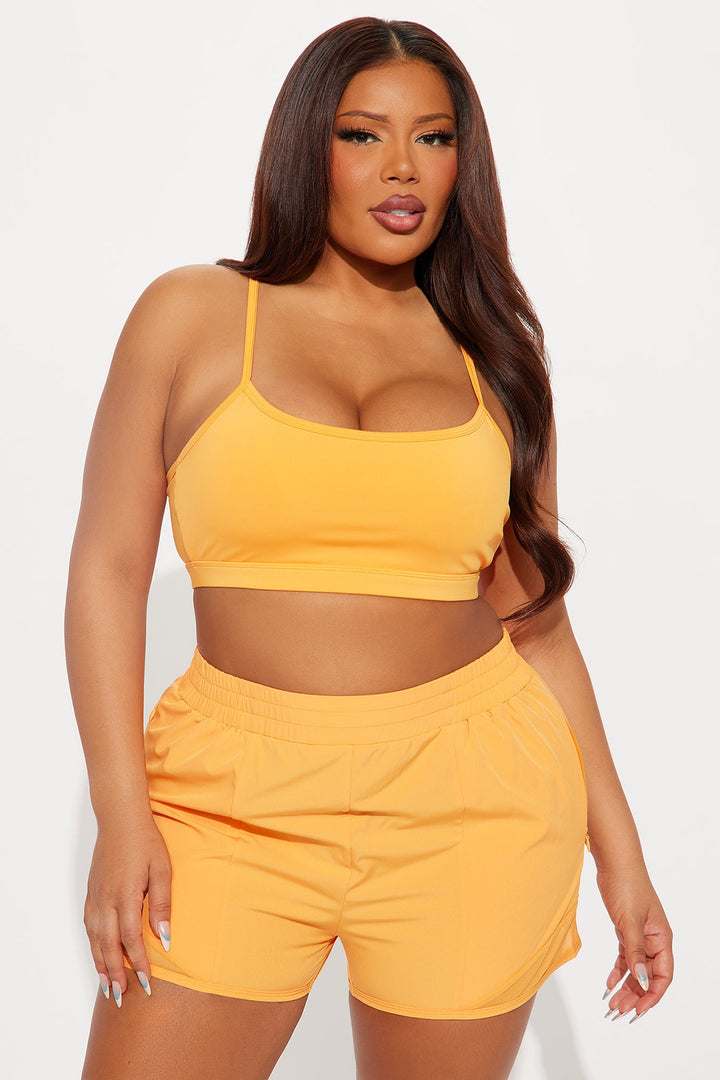 Available In Slate Blue And Tangerine. | Sports Bra | Scoop Neck | Sleeveless | Elevate | High Impact | Stretch | Pair With "Outer Glow Active Running Short" | Self: 73% Polyester 27% Spandex | Mesh: 82% Nylon 18% Spandex | Imported