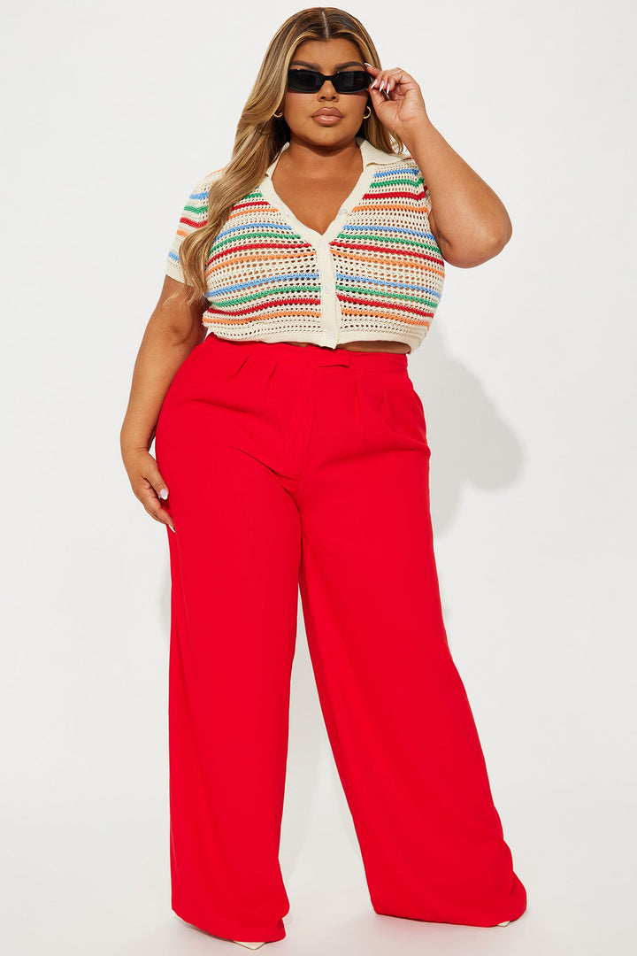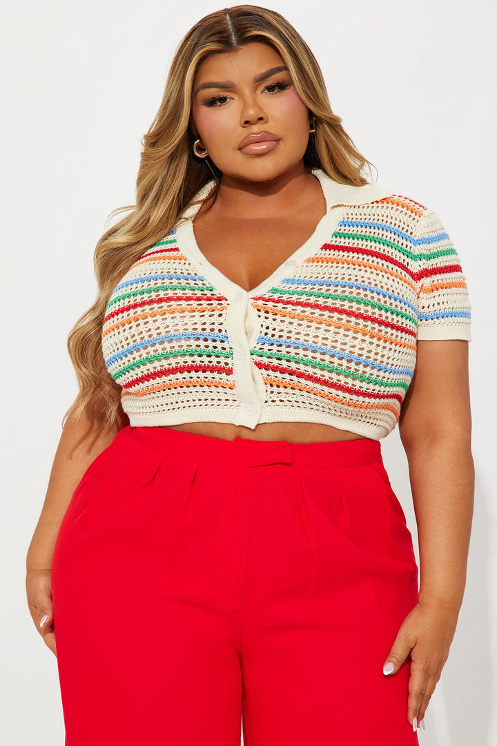 Available In Taupe/combo. | Sweater Top | Short Sleeve | Button Down | Collar | Striped | Crochet | Ribbed Hem | Cropped | Shell: 100% Polyester | Imported