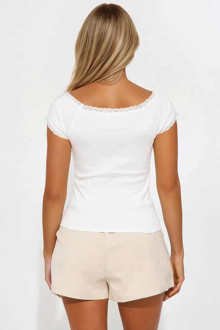 Available In Black, Blue And Off White. | Ribbed Baby Tee | Stretch | Lace Trim | Short Sleeve | 100% Cotton | Imported