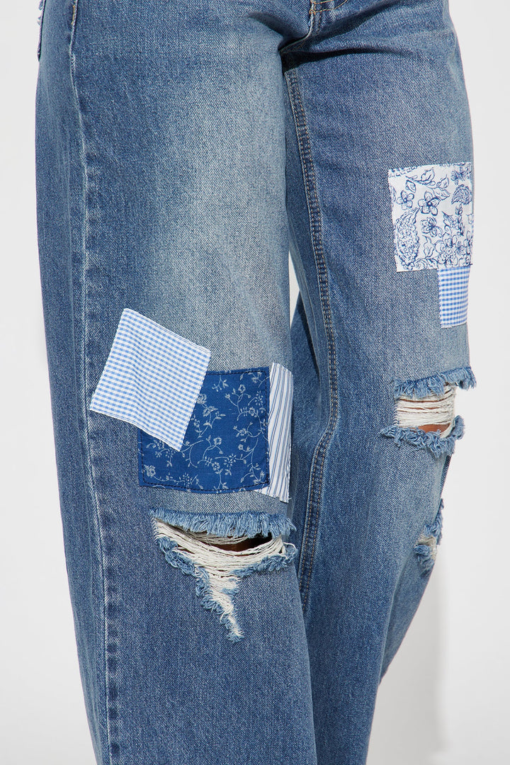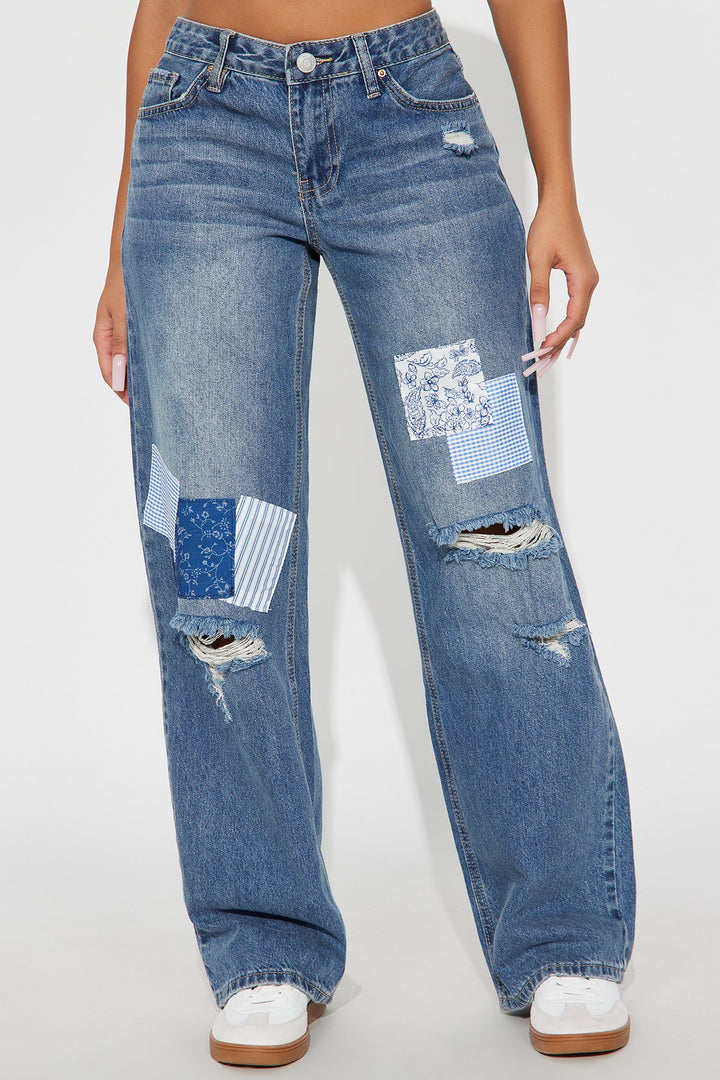 Available In Medium Wash. | Wide Leg Jean | 5 Pocket | Ripped | Patchwork | 9" Low Rise | 30" Inseam | Non-Stretch | Disclaimer Due To The Specialized Wash Process, Each Garment Is Unique. | 100% Cotton | Imported