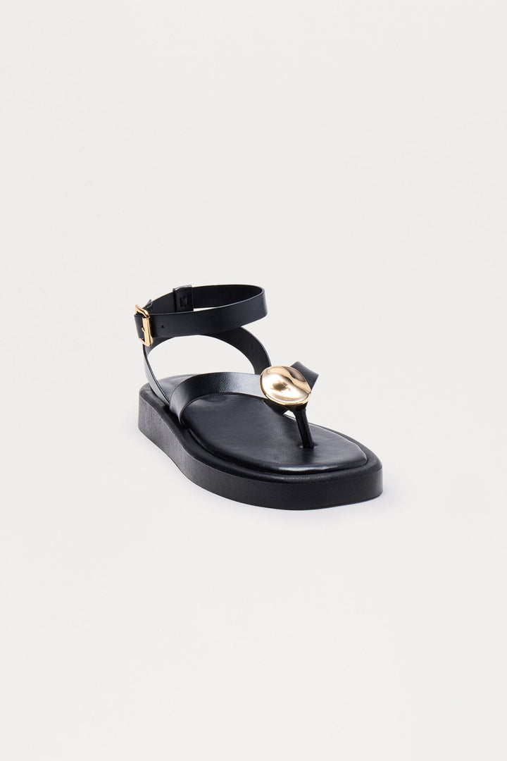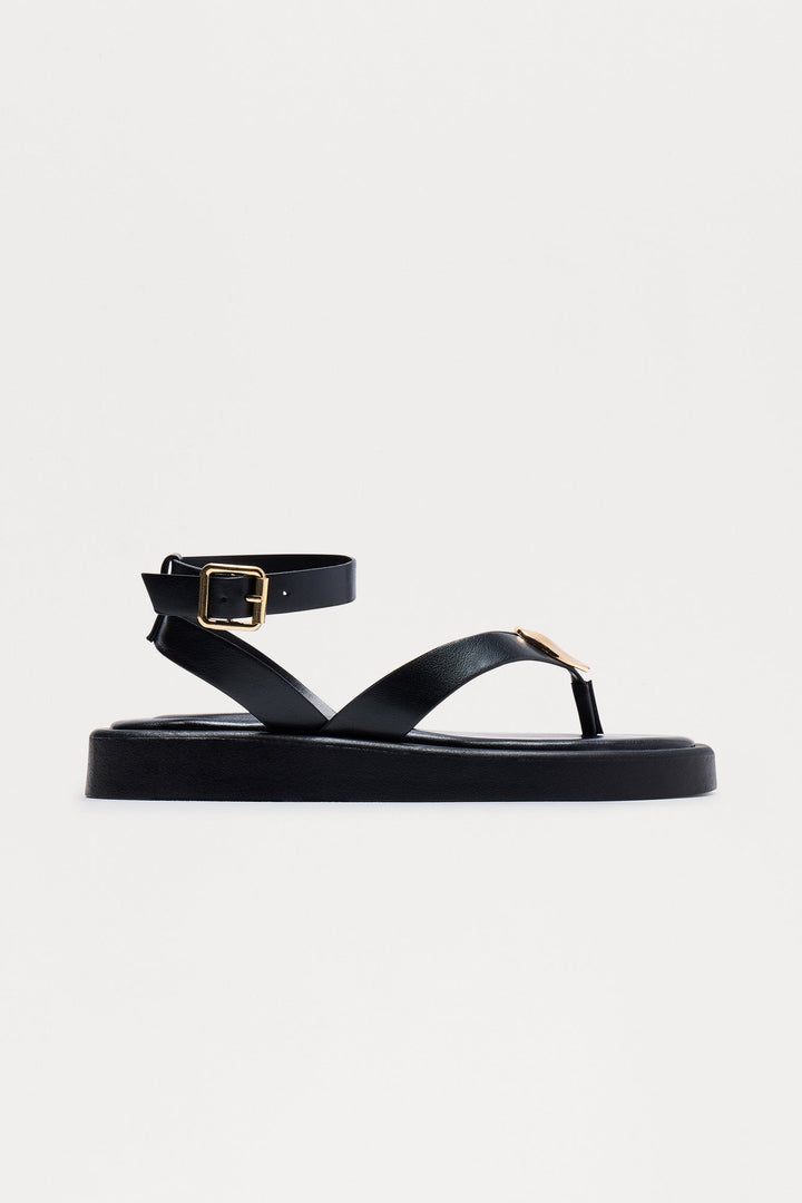 Available In Black. | Flat Sandals | Hardware Detail | Square Toe | Flat Heel | Imported