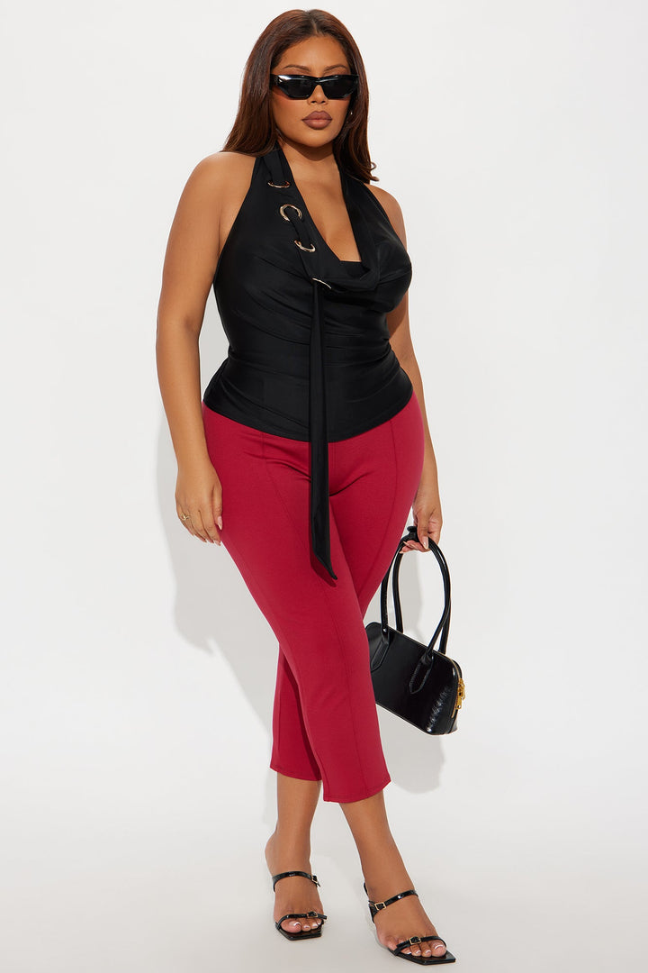 Available In Black. | Halter Top | Cowl Neck | Hardware | Cut Out | Draped Detail | Stretch | Shell: 82% Nylon 18% Spandex | Lining: 82% Nylon 18% Spandex | Imported