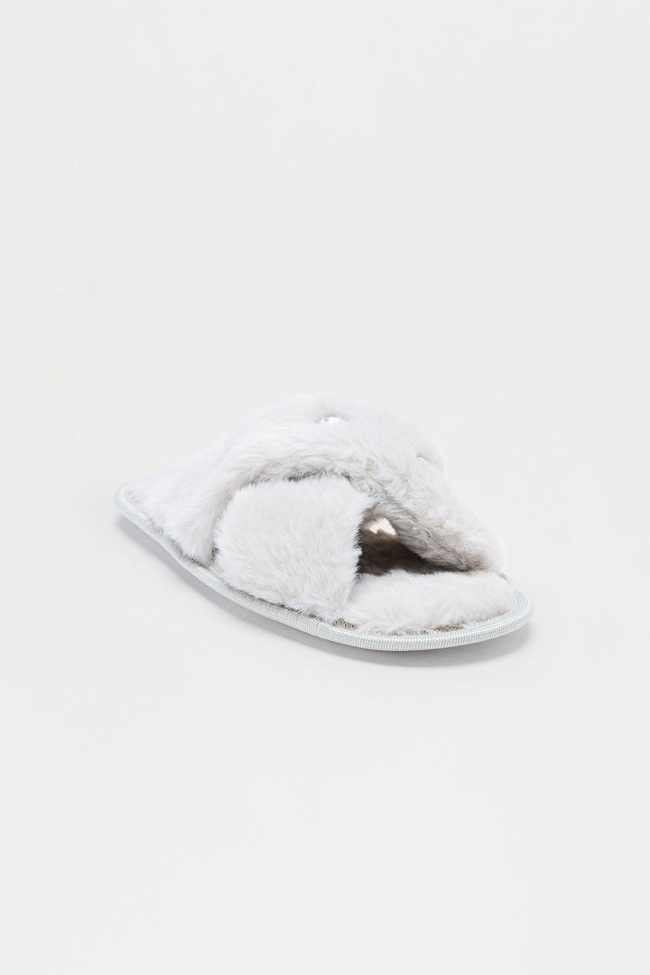 Piper Rhinestone Faux Fur Slippers - Grey