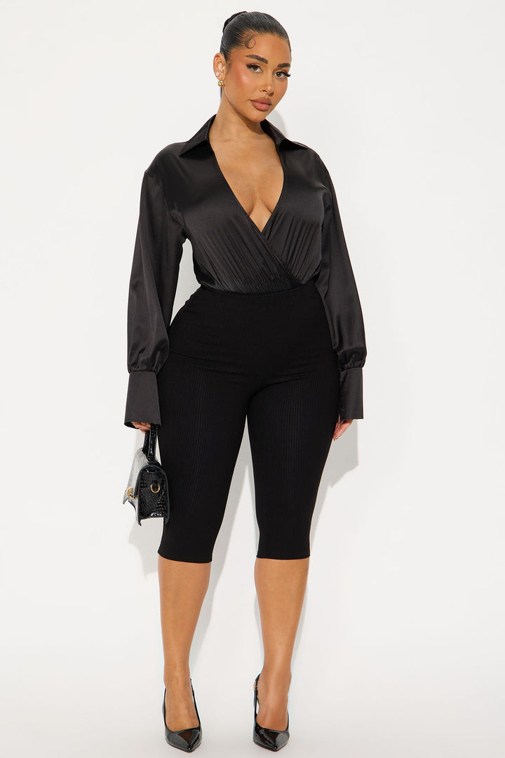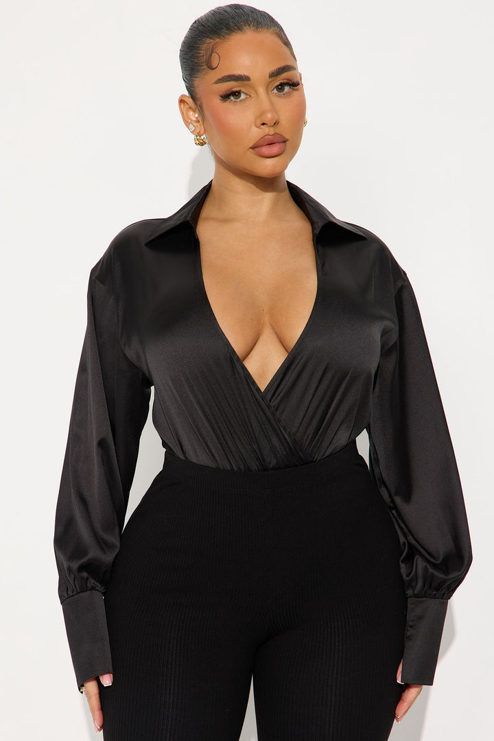 Available In Black And Hunter. | Bodysuit | Collar | Long Sleeve | Satin | Button Snap Closure | Cheeky Bottom | Non Stretch | Final Sale | Self : 95% Polyester 5% Spandex | Imported