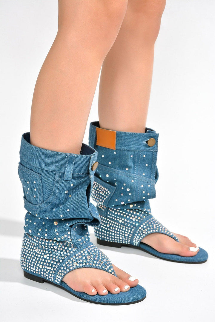 PLEXI - DENIM - BOOTIES by CAPE ROBBIN round toe denim finish flat booties rhinestone trim These denim-finished Plexi booties are sure to turn heads with their added rhinestone trim to give a sprinkle of sparkle. Available in black and denim.