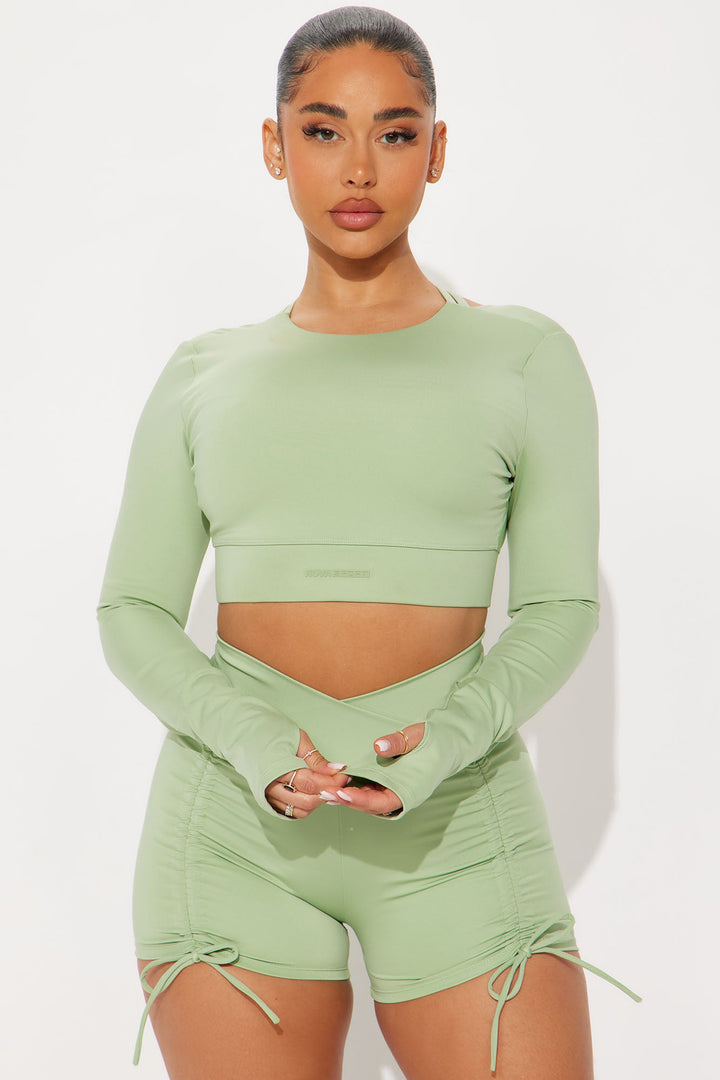 Available In Black And Sage. | Active Top | Crew Neck | Long Sleeve | Elevate | Cutout Detail | Strappy Detail | Thumbhole | High Impact | Stretch | Pair With "Pointe Play Elevate Active Biker Short" | Body: 73% Polyester 27% Spandex | Inner Mesh: 82% Nylon 18% Spandex | Imported