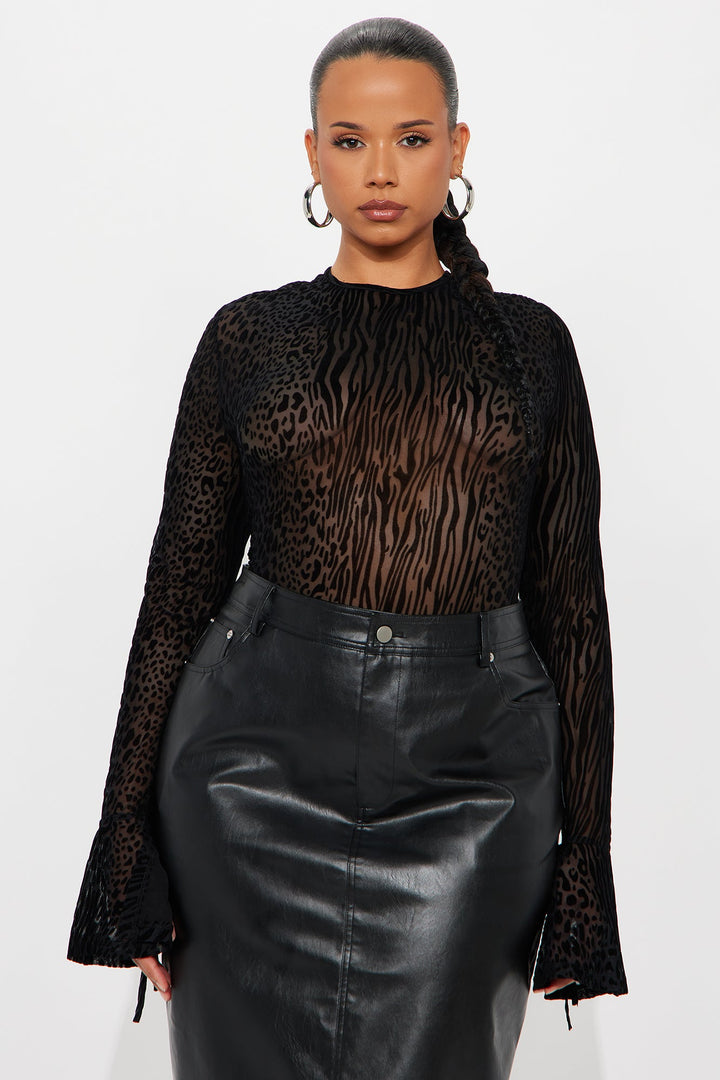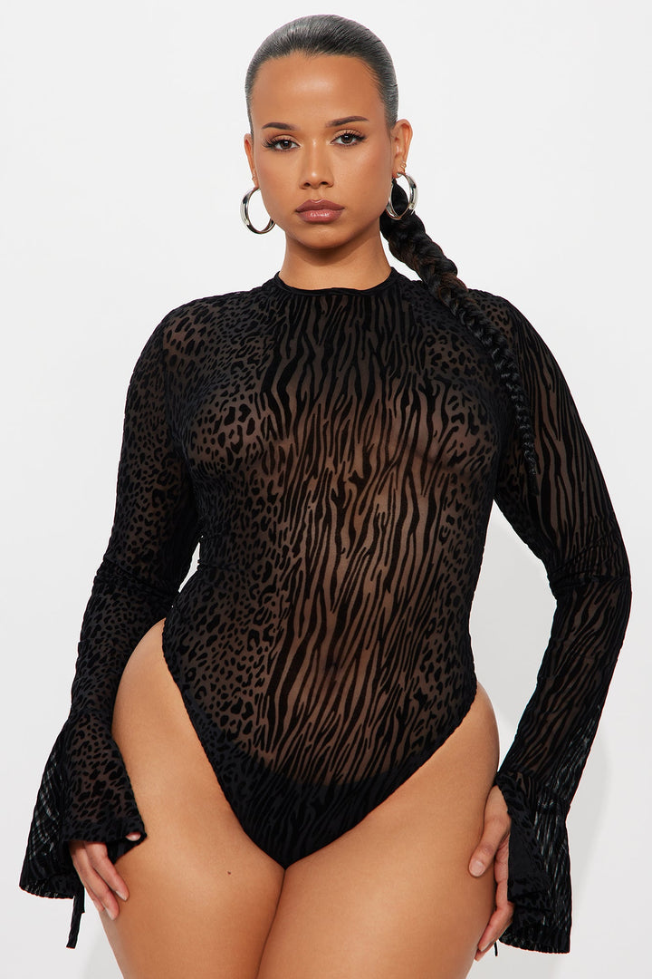 Power Play Flocked Mesh Long Sleeve Bodysuit - Black