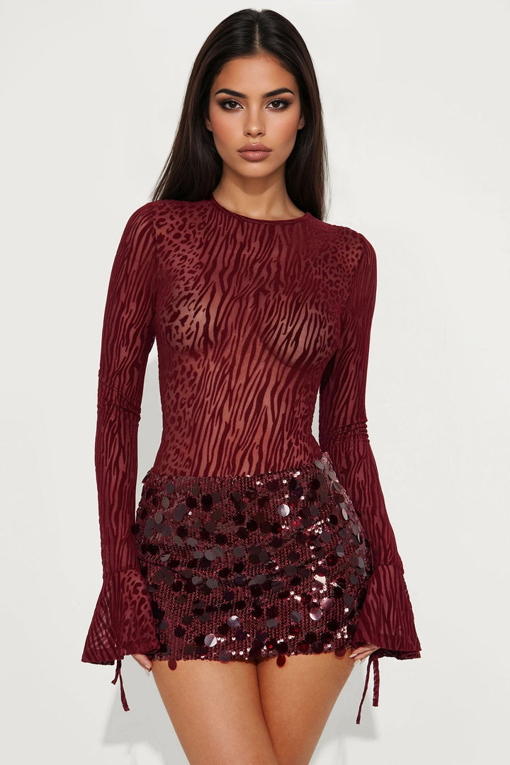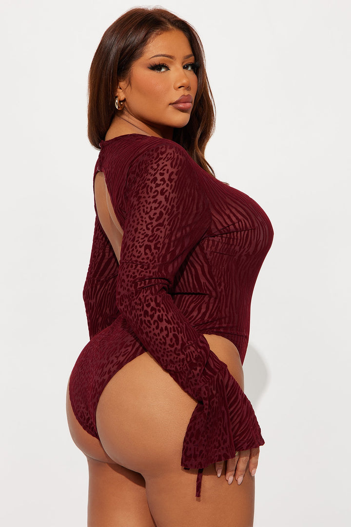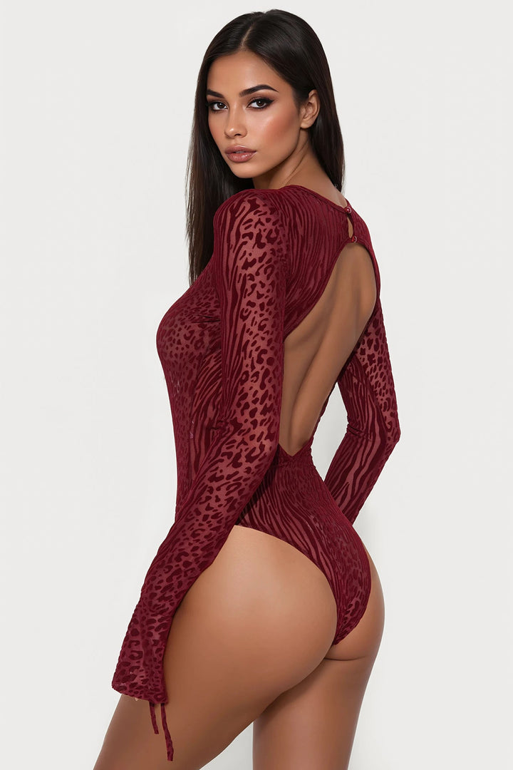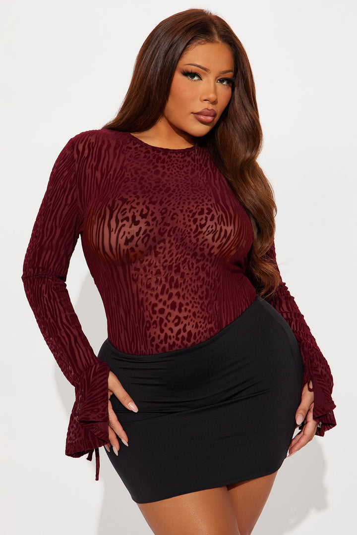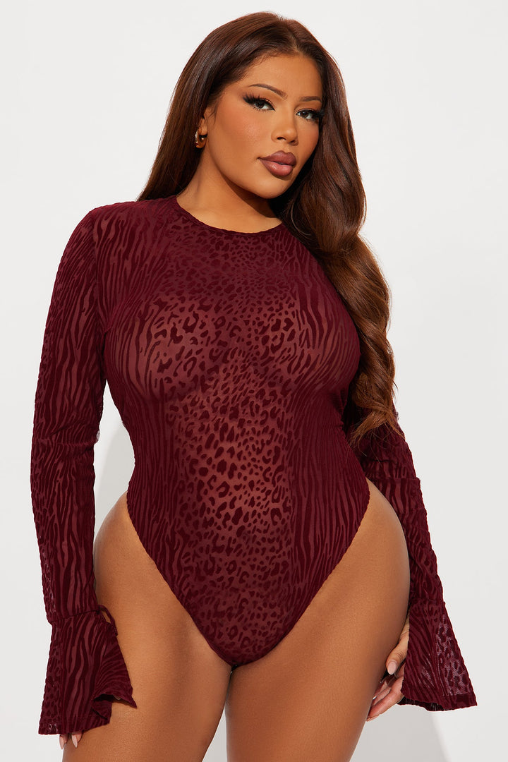 Power Play Flocked Mesh Long Sleeve Bodysuit - Burgundy