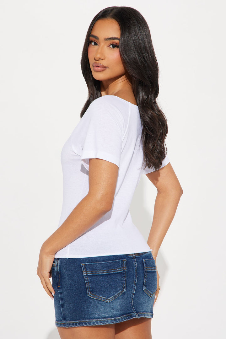Available In White. | Off Shoulder Top | Short Sleeve | Graphic Screen Print Detail | Stretch | Disclaimer: Due To The Screen Printing Process A Difference In Saturation May Occur. Each Garment Is Unique. | 100% Cotton | Imported