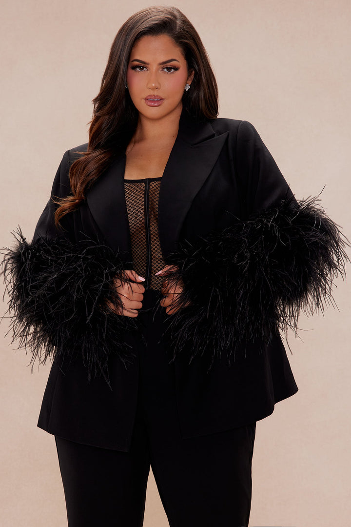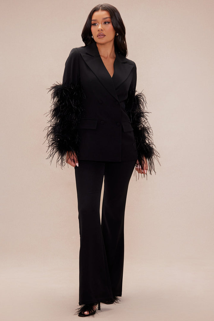 Available In Black. | Feather Trim Blazer | Non Stretch | Lined | Double Breasted | Long Sleeve | Two Front Pockets | Back Vent | Notched Collar | Shell / Lining: 93% Polyester 7% Spandex | Imported