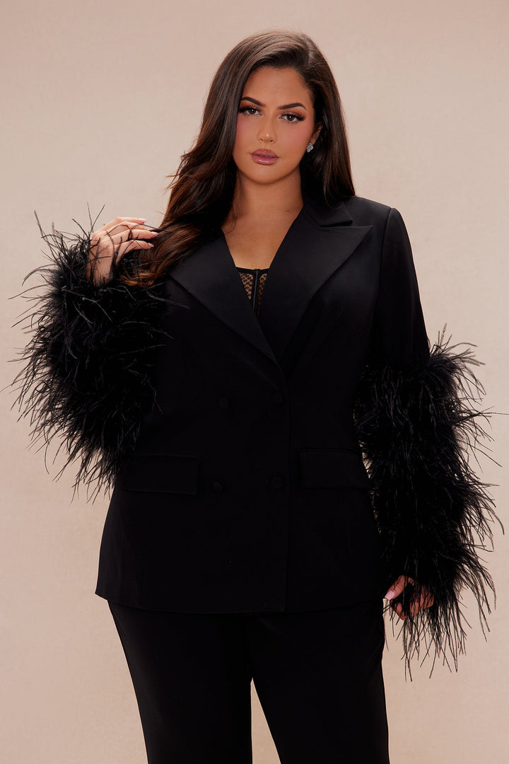 Available In Black. | Feather Trim Blazer | Non Stretch | Lined | Double Breasted | Long Sleeve | Two Front Pockets | Back Vent | Notched Collar | Shell / Lining: 93% Polyester 7% Spandex | Imported