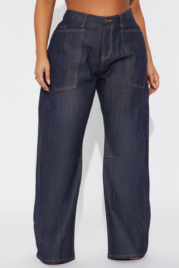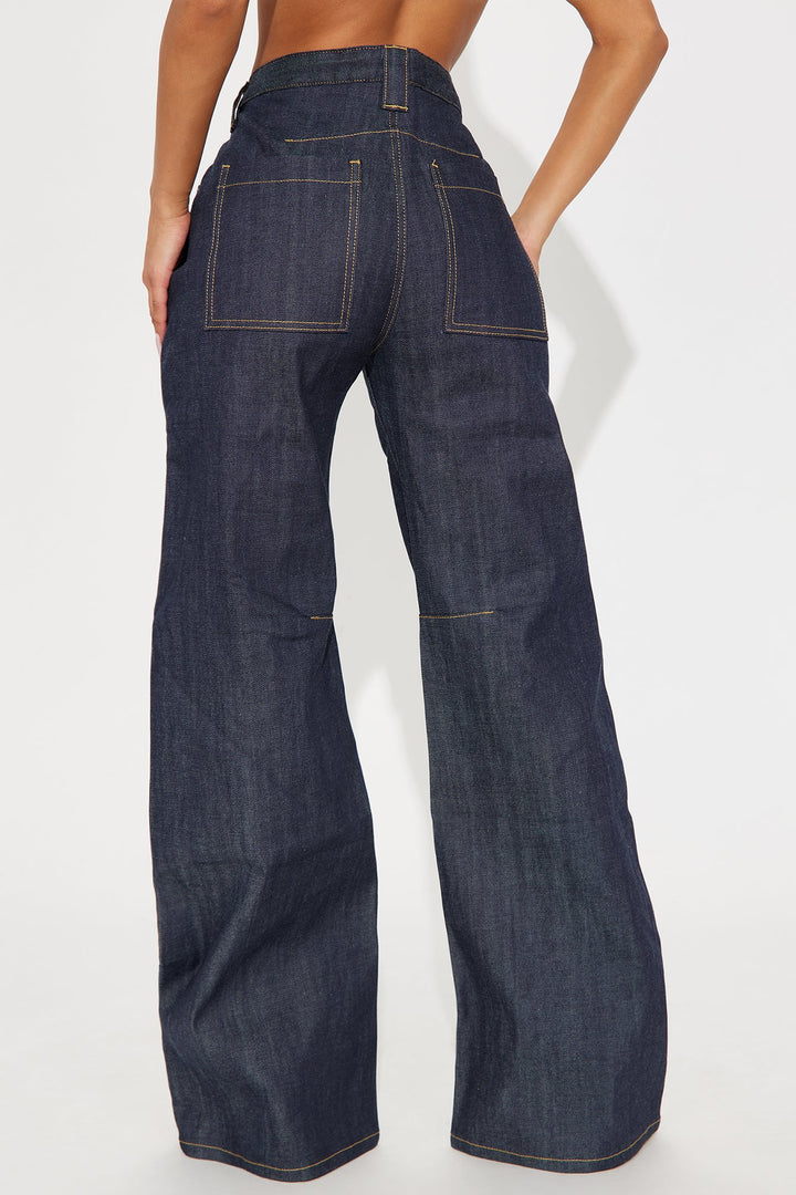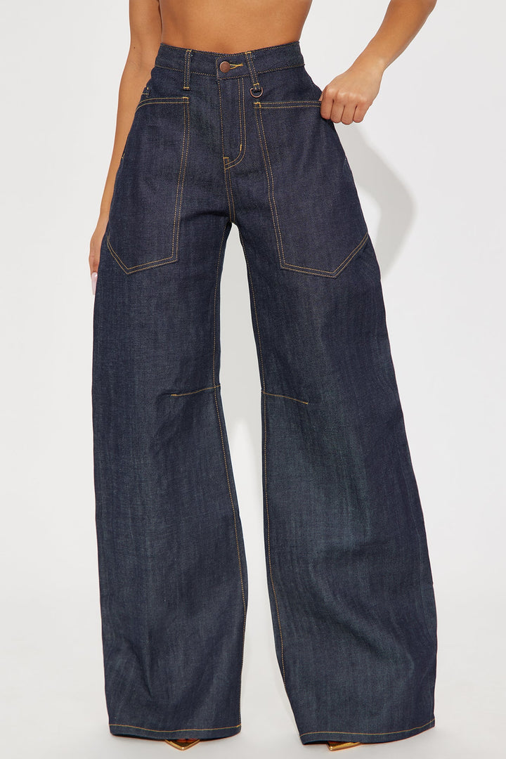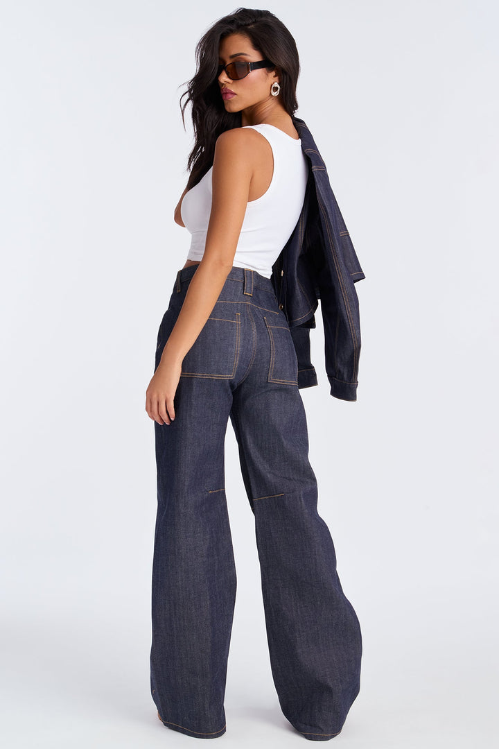 Available In Dark Denim. | Pair With Premium Selvedge Denim Bustier Top | Wide Leg Jean | Disclaimer: Due the To The Specialized Dye Process, Loose Dye Can Stain On Contact. Do Not Wash with Other Garments | Cargo Pockets | Utility Detail | 11" Rise | 34" Inseam | Low Stretch | 99% Cotton 1% Spandex | Imported