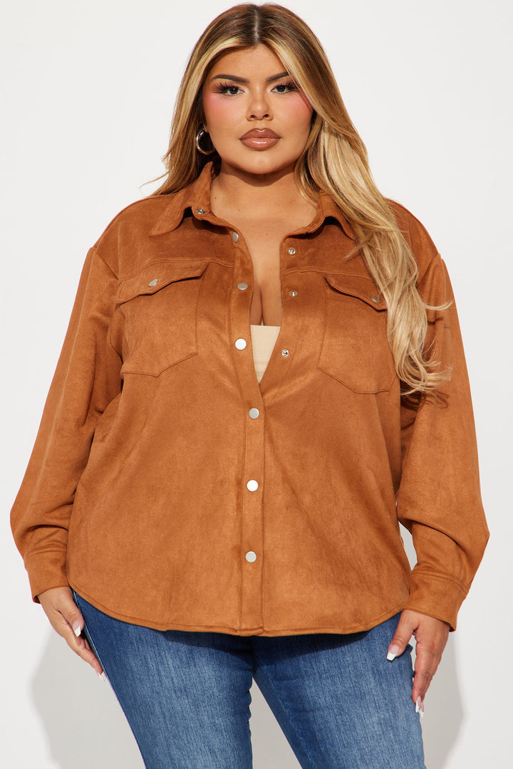 Available In Camel. | Faux Suede Shirt | Long Sleeve | Snap Button Down | Collar | 2 Front Pockets | Partially Stretch | 95% Polyester 5% Spandex | Imported