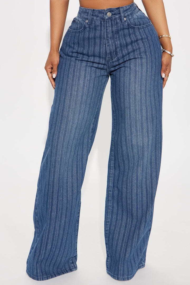 Available In Dark Wash. | Pair With Preston Jacquard Denim Jacket | Wide Leg Jean | 5 Pocket | Jacquard Stripe | 12" High Rise | 34" Inseam | Heavy Weight Denim | Non Stretch | Disclaimer: Print Placement Will Vary | 75% Cotton 25% Polyester | Imported