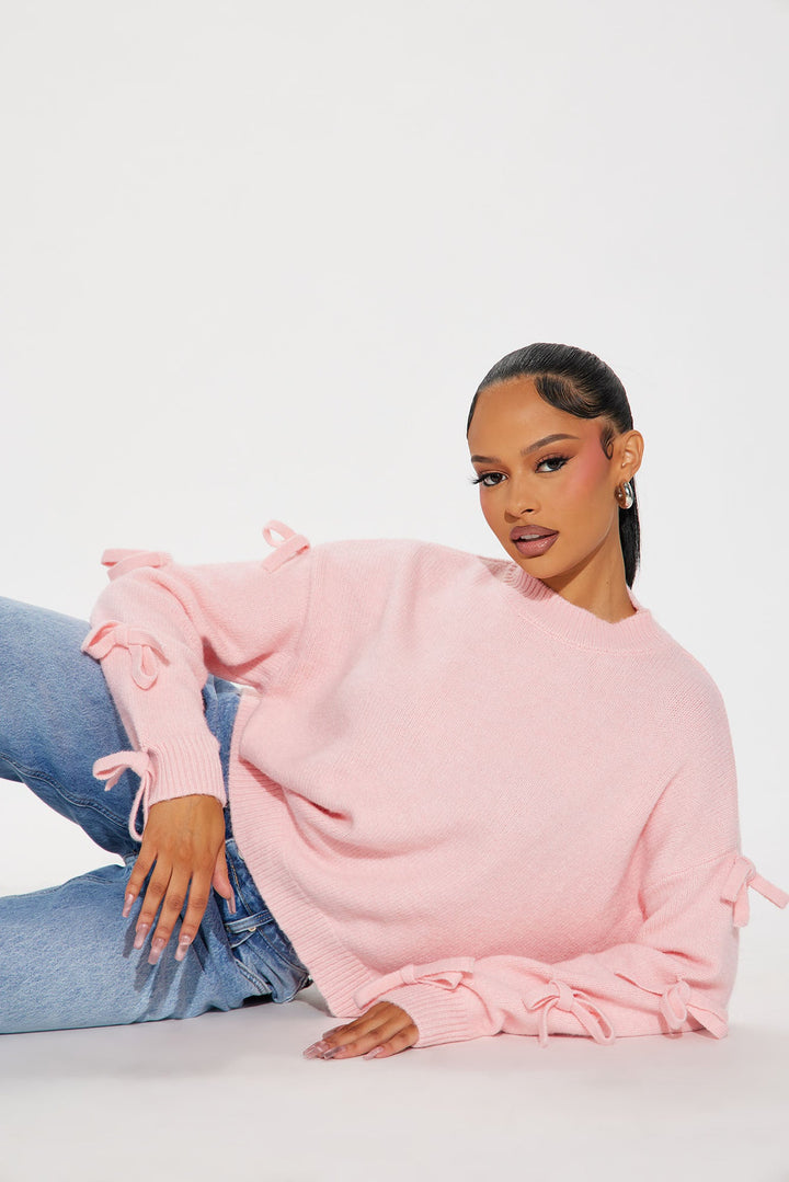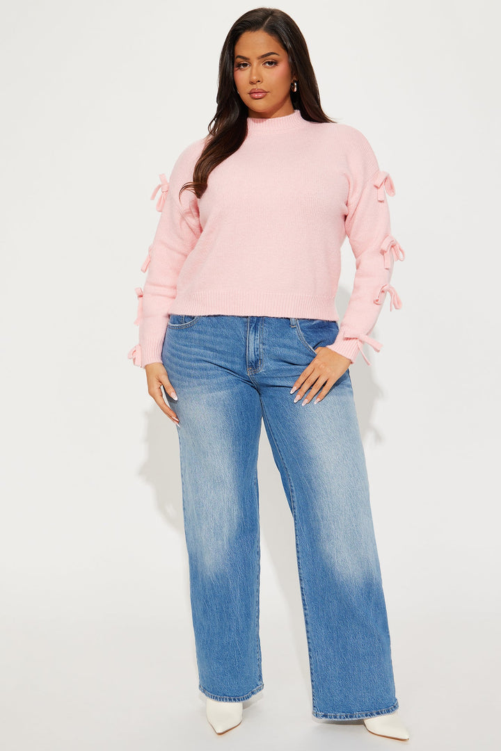 Available In Pink. | Pullover Sweater | 3D Bow Sleeve Details | Long Sleeve | Mock Neck | Ribbed Hem | 61% Acrylic 25% Polyester 14% Nylon | Imported