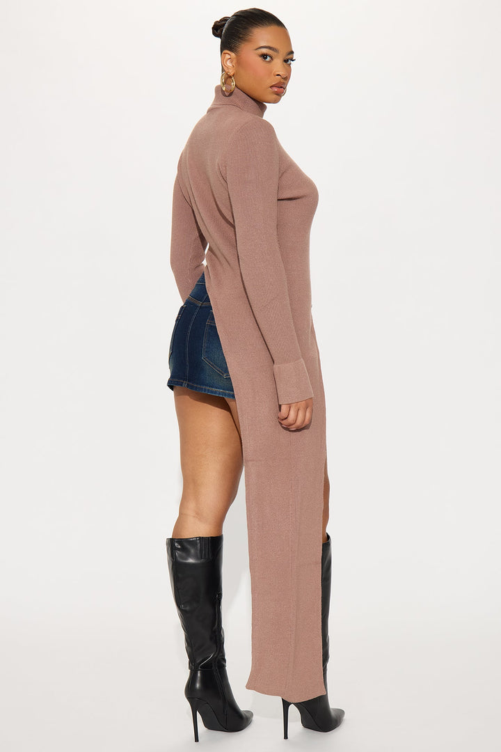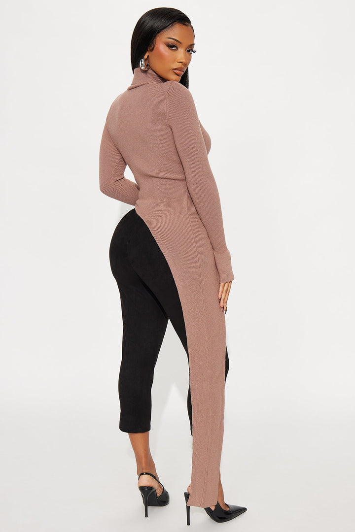 Available In Ivory And Mocha. | Sweater | Turtle Neck | Long Sleeve | Viscose Blend | Asymmetrical Hem | Stretch | 43% Polyester 39% Viscose 18% Nylon | Imported
