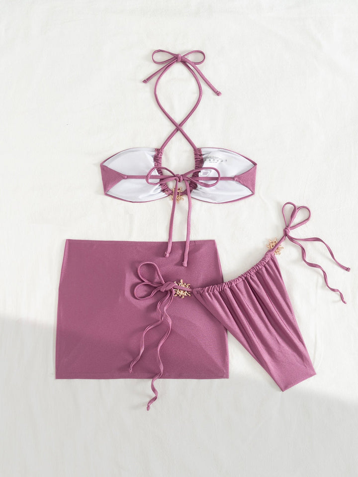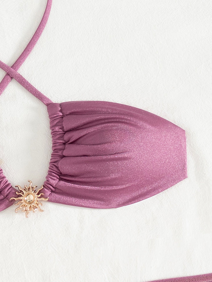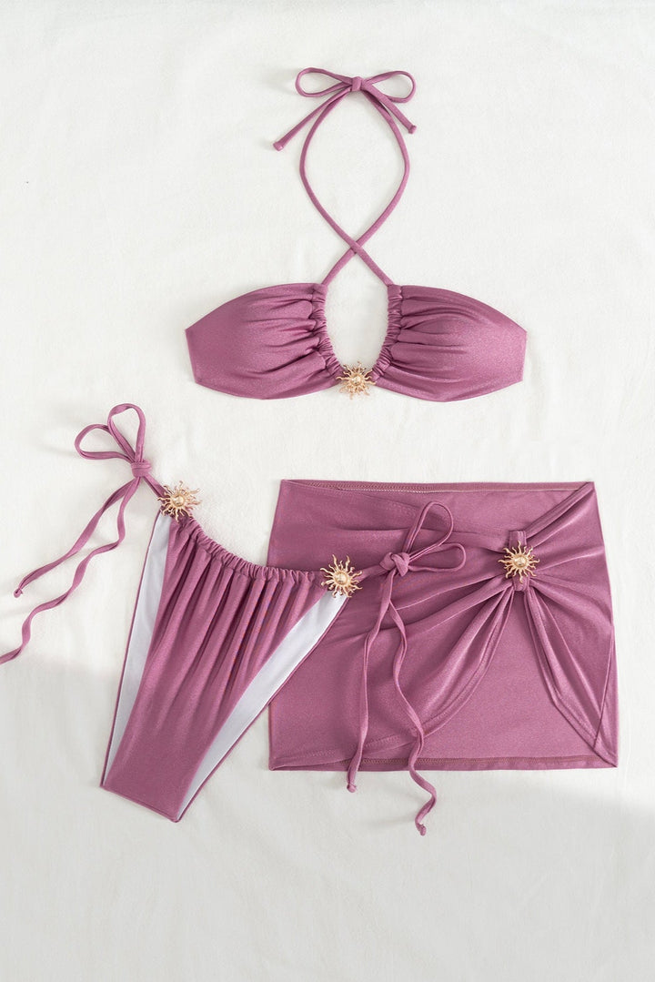Purple Gold Sun Decor Halter Bandeau Cheeky Mesh Cover-Up 3Pc Swimsuit Set